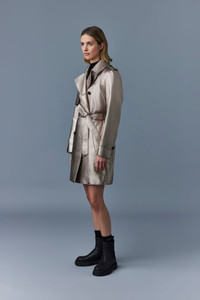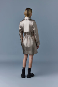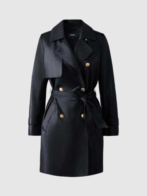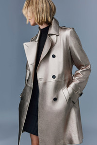 MELY is a double-breasted long trench coat crafted from premium leather. Fully lined with a windproof shell for brisk autumn mornings and as a top layer for colder weather. Epaulettes, detachable throat latch, and edge-painted leather throughout exude refined tailoring. On windy days turn up the extended spread collar and cinch the adjustable belt buckle. Welt pockets, rain shedder at front and back, and adjustable sleeve tabs add utilitarian detail to the long relaxed silhouette. A statement piece with endless layering options. - Long leather trench coat - Double-breasted button closure - Wide notched lapel collar - Detachable throat latch with buttons - Left-sided rain shedder - Removable sash belt - Adjustable sleeve tabs with buttons - Welt waist pockets - Vent at center back - Epaulette shoulders - Fully lined - Edge painted detailing - Relaxed fit SIZE & FIT - RELAXED – Loose fit for on the go comfort. - Designed to be worn with heavier layers. - The model is 5'11" (180 cm) and wears a size XS. - Length from shoulder to hem: 35'' / 89 cm. COMPOSITION & CARE INSTRUCTIONS - Shell: 100% lamb leather. Lining: 100% viscose. - Dry clean by leather specialist using oil based solvent only. Do not use perchloroethylene.