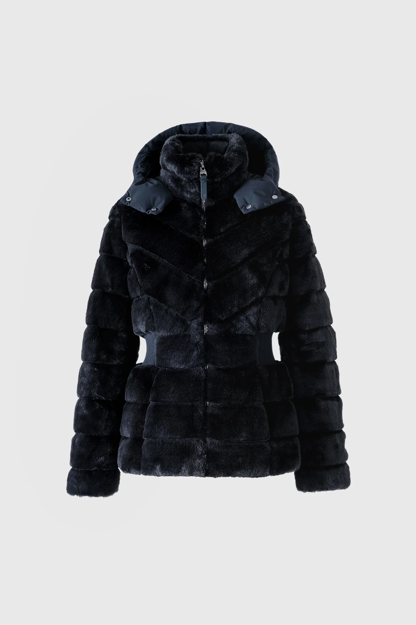 MIRANDA is a semi-fitted down jacket with a faux fur shell. Featuring mixed textures, chevron quilting, and a lightweight down hood, it blends functional warmth with clean lines. The removable storm visor hood and hidden side zip pockets offer adaptive versatility in shifting conditions. A cold-weather essential with a sharp, streamlined look. DETAILS - Mixed-media down jacket - Faux fur shell with stretch lightweight down nylon hood - GRS-certified recycled down - Chevron-quilted body and sleeves - Mixed media construction - Removable contrast hood with stand collar - Smocked elasticized side panel detailing - 2-way center front zipper closure - Insulated hidden zipper pockets at side seam - Inner welt pocket with zipper - Signature "M" logo on left sleeve - Temperature Rating: -5°C - Semi-fitted SIZE & FIT - SEMI-FITTED – Follows your body’s shape with ease. - Designed to be worn with light layers. - The model is 5'11" (180 cm) and wears a size S. - Coat length from shoulder to hem: 25'' / 69 cm. COMPOSITION & CARE - Shell: 100% polyester. Lining: 100% recycled nylon. Filling: 90% recycled down, 10% recycled feathers. - Dry clean by leather specialist using oil based solvent only. Do not use perchloroethylene.