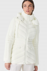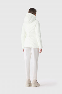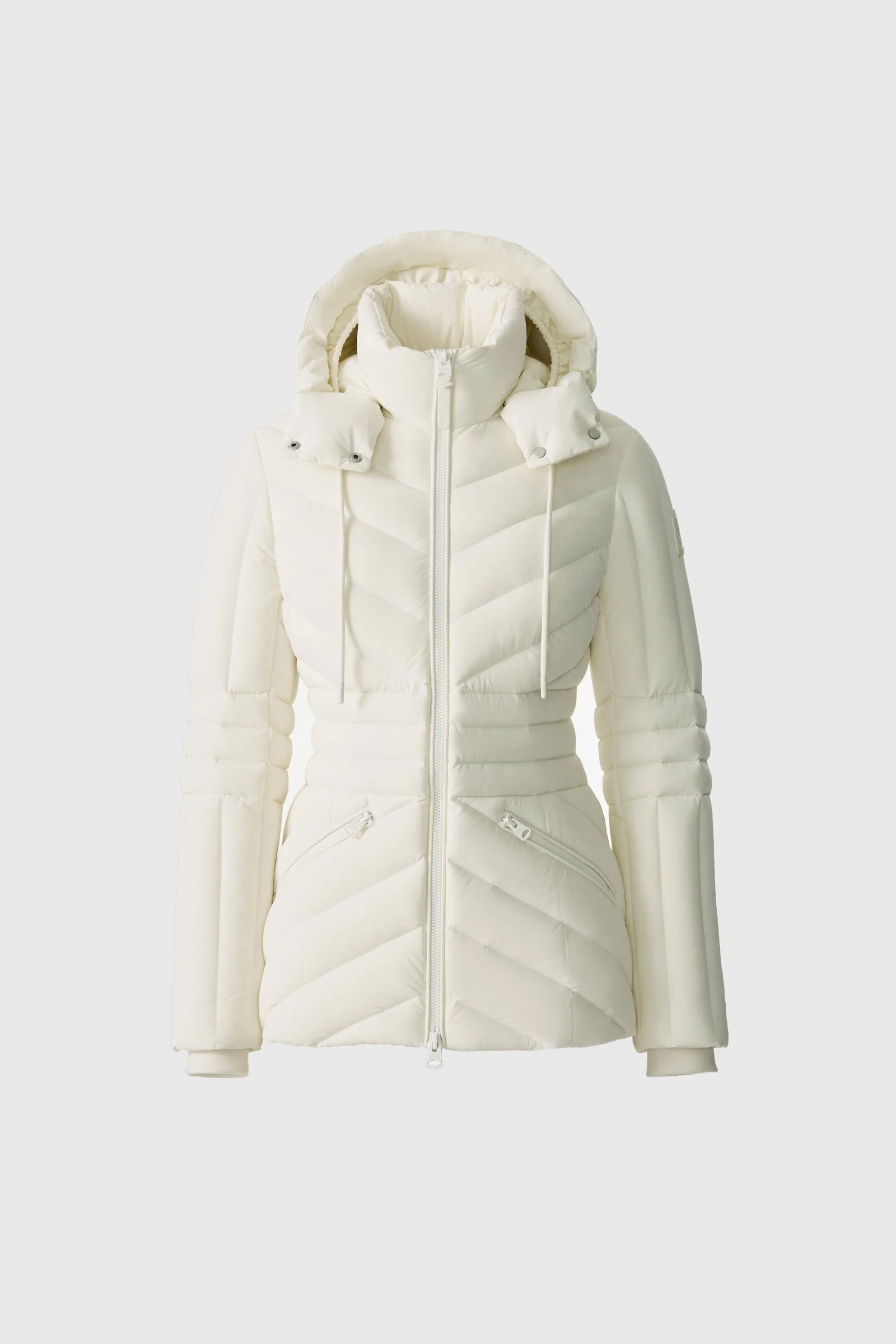 NADIA-NFZ is a fitted down jacket crafted from a stretch technical fabric for enhanced comfort and mobility. Engineered for performance in cold weather, it features GRS-certified recycled down, and a storm visor with adjustable drawcord for added protection. A removable hood, rib knit cuffs, and chevron quilting complete this modern outerwear essential. Finished with signature “M” sleeve logo and branded drawcord details. DETAILS - Stretch down jacket - GRS certified recycled down - Chevron quilted body and sleeves - 2-way center front zipper closure - Removable hood - Adjustable storm visor with drawcord - Rib knit cuffs - Waist pockets with zippers - Inner welt pocket with zipper - “M” logo on left sleeve - Piping detail - Fully lined - “MACKAGE” branded drawcord at hood - Fitted silhouette - Temperature rating: -15°C SIZE & FIT - FITTED – Our signature fit, closest to the body. - Designed to be worn with light layers, all while keeping you warm. - For heavier layering, we recommend sizing up. - The model is 5'11" (180 cm) and wears a size S. - Coat length from shoulder to hem: 27.5'' / 133 cm. COMPOSITION & CARE - Shell: 82% recycled nylon, 18% elastane/spandex. Lining: 82% recycled nylon, 18% elastane/spandex. Filling: 90% recycled down, 10% recycled feathers. Water-repellent, water-resistant. - Close zippers. Remove fur. Remove all removable trims. Wash inside out. Wash in domestic machine in water not exceeding 40°c, at normal setting. Use mild detergent. remove immediately after washing. Do not soak. Tumble dry low heat with tennis balls, until fully dried (1to 3 hours). Do not wet-clean. Do not bleach. Do not wring. Do not iron or press. Dry clean using oil based solvent only. Do not use perchloroethylene.