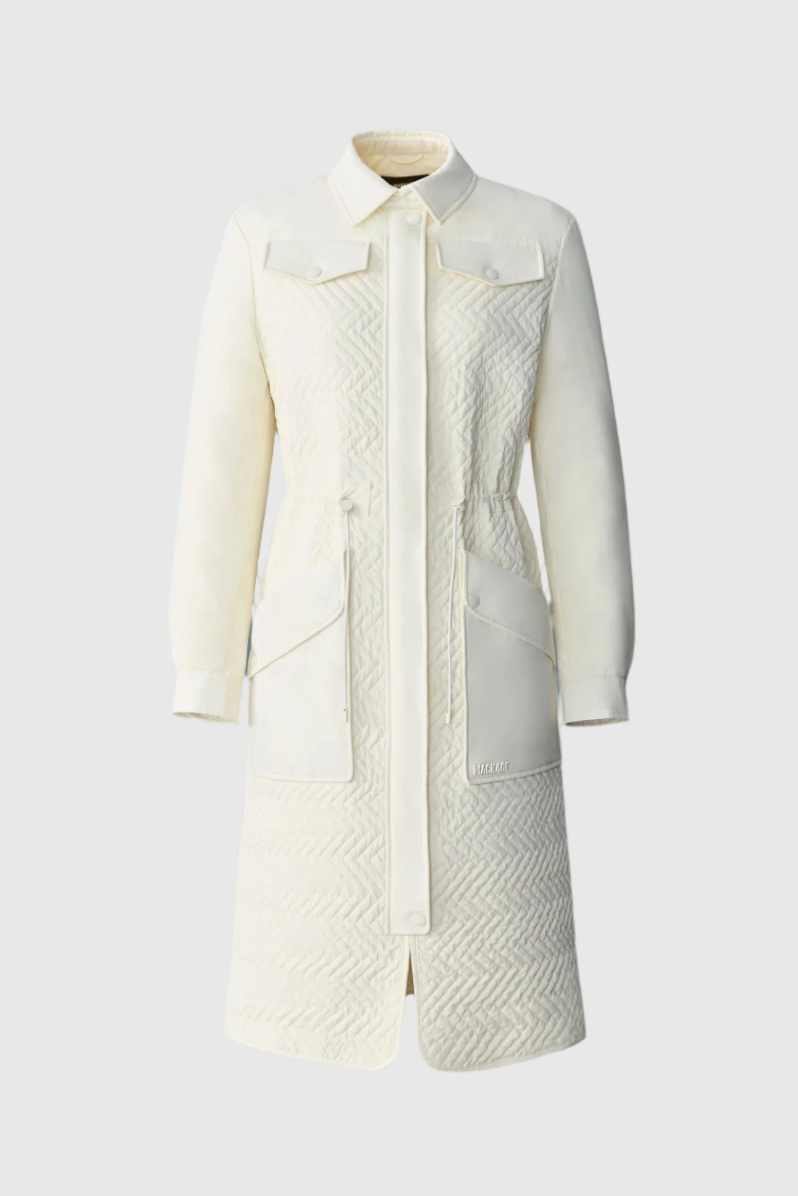 NAOLIN is a semi-fitted long coat made from recycled nylon and GRS-certified recycled down, designed for lightweight warmth. It features a shirt collar, zipper closure with a snap placket, and an adjustable bungee at the waist for a customizable fit. Utility-inspired double-entry and chest flap pockets provide ample storage, while adjustable cuffs add functional versatility. The unlined construction compliments the silhouette and makes it easy to layer. DETAILS - Made from recycled nylon blend - GRS-certified recycled down - Shirt collar - Center front zipper closure - Double entry pockets with flaps and exposed snaps - Chest pocket flaps with snaps - Adjustable drawcord at waist - Adjustable sleeve cuff with snap - Center front placket with snaps - Vent at center back - MACKAGE silicone logo on patch pocket (outer layer) - Unlined - Machine washable - Semi-fitted - Temperature rating: -5°C SIZE & FIT - SEMI-FITTED – Follows your body’s shape with ease. - Designed to be worn with light layers. - The model is 5'11" (180 cm) and wears a size S. - Coat length from shoulder to hem: 41.5'' / 53 cm. COMPOSITION & CARE - Shell: 82% recycled nylon, 18% elastane/spandex. Filling: 90% recycled down, 10% recycled feathers. Water-repellent, water-resistant. - Close zippers. Remove fur. Remove all removable trims. Wash inside out. Wash in domestic machine in water not exceeding 40°c, at normal setting. Use mild detergent. remove immediately after washing. Do not soak. Tumble dry low heat with tennis balls, until fully dried (1to 3 hours). Do not wet-clean. Do not bleach. Do not wring. Do not iron or press. Dry clean using oil based solvent only. Do not use perchloroethylene.