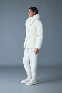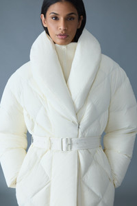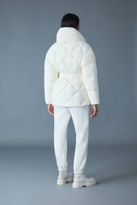 OLIVE-Z is a stretch down jacket featuring a soft shawl collar and elegant quilted silhouette. Engineered for moderate cold with a temperature rating of -10°C, it’s filled with GRS-certified down and crafted from sustainable materials. A snap front closure and hidden side zipper pockets add streamlined functionality, while the inner welt pocket and waist-defining belt offer refined structure and utility. DETAILS - Down jacket with wraparound construction - Lightweight stretch recycled nylon - Water-repellent and resistant - Diamond quilted body and sleeves - Snap front closure - Shawl collar - Hidden zipper pockets at side seam - Inner welt pocket with zipper - “M” logo on left sleeve - Adjustable belt with buckle at waist - Fully lined - GRS-certified recycled down - Sustainable, washable, and lightweight warmth - Temperature rating: -10°C - Regular fit SIZE & FIT - REGULAR – Classic fit allowing comfort and style. - Designed to be worn with heavier layers. - The model is 5'11" (180 cm) and wears a size S. - Coat length from shoulder to hem: 28.75'' / 121 cm. COMPOSITION & CARE - Shell: 82% recycled nylon, 18% elastane/spandex. Lining: 82% recycled nylon, 18% elastane/spandex. Filling: 90% recycled down, 10% recycled feathers. Water-repellent, water-resistant. - Close zippers. Remove fur. Remove all removable trims. Wash inside out. Wash in domestic machine in water not exceeding 40°c, at normal setting. Use mild detergent. remove immediately after washing. Do not soak. Tumble dry low heat with tennis balls, until fully dried (1to 3 hours). Do not wet-clean. Do not bleach. Do not wring. Do not iron or press. Dry clean using oil based solvent only. Do not use perchloroethylene.