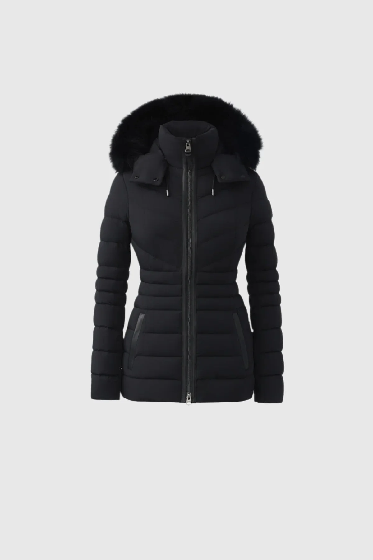 PATSY-BX is a classic mid-length jacket for women meticulously tailored from our proprietary light recycled down and Agile 360 stretch shell. Combining sleek lines with high-performance, the removable hood boasts a plush sustainable blue fox fur trim that can be detached on warmer days. Graphic chevron quilting and sustainable leather detailing accentuate the form-fitting silhouette. DETAILS - Mid-length light down coat - 100% recycled down - Agile 360 2-way stretch shell - Chevron quilt upper body - Channel quilt lower body - Removable hood with adjustable drawcord storm visor - Detachable sustainable blue fox fur trim around hood - Centre front zip closure with (R) Leather tape - Insulated zip waist pockets with (R) Leather welt - Inside pocket - Signature M logo on left sleeve - Signature closest-to-the-body fit SIZE & FIT - FITTED – Our signature fit, closest to the body. - Designed to be worn with light layers, all while keeping you warm. - For heavier layering, we recommend sizing up. - Coat length from shoulder to hem: 27.5'' / 69.85 cm. COMPOSITION & CARE - Shell (Woven): 82% polyamide/nylon, 18% elastane/spandex. Combo 100% cow leather. Lining: 82% polyamide/nylon, 18% elastane/spandex. Filling: 90% chinese pure white goose down, 10% feathers. Fur: 100% finland blue fox. Water-repellent & water-resistant. - Dry clean by leather specialist using oil based solvent only. Do not use perchloroethylene.