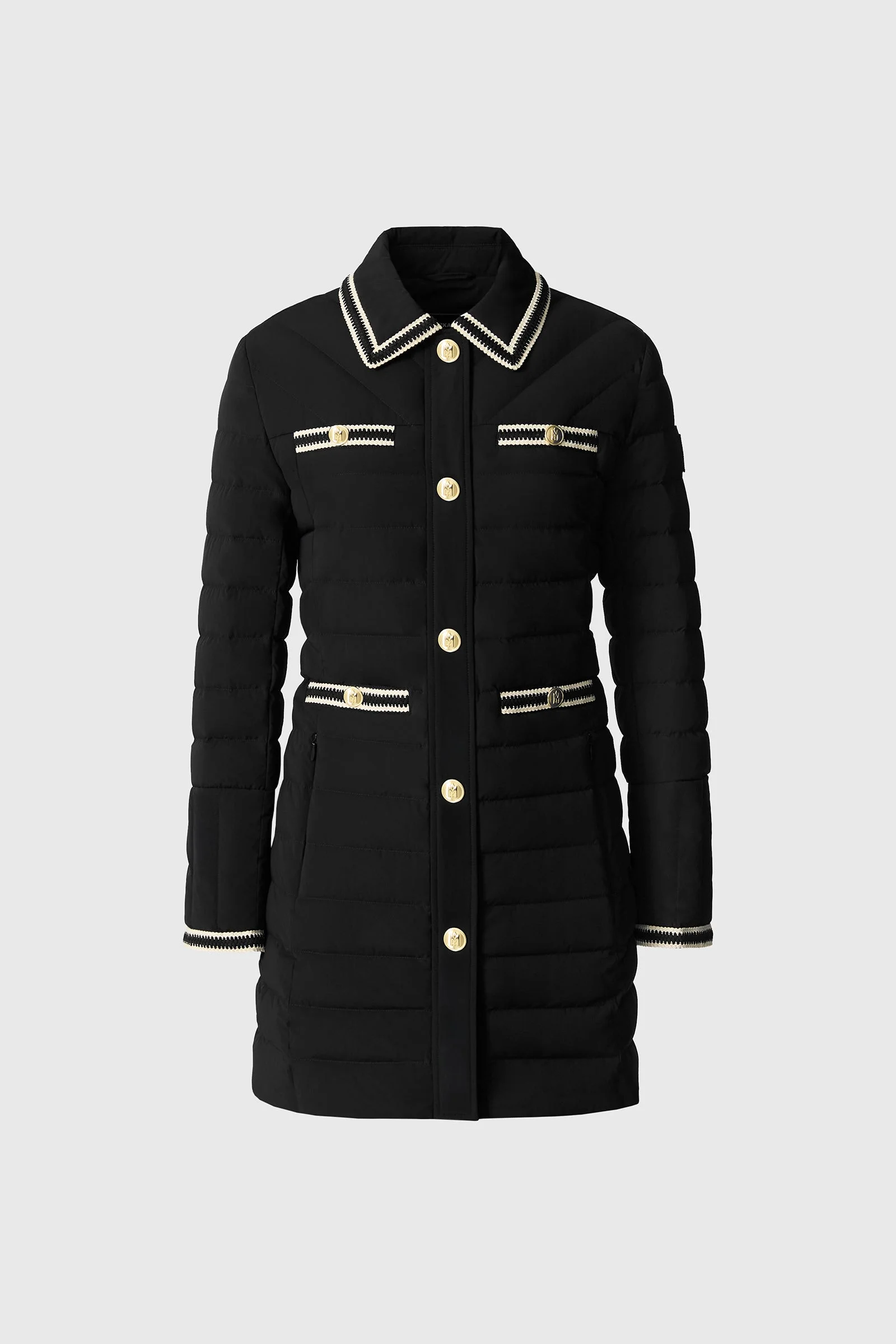 PRECIOUS is a straight-fit long down coat crafted from stretch lightweight shell for ease of movement. Insulated with GRS-certified recycled down, it delivers warmth rated to -5°C with a smooth, downproof finish. The design features a shirt collar, button placket opening, and crochet detailing at the collar, cuffs, and pockets for elevated texture. Fully lined and finished with ‘M’ logo applique, it blends functional insulation with refined craftsmanship. DETAILS - Long stretch lightweight down coat - Temperature Rating: -5°C - Water-resistant and repellent - GRS-certified recycled down - Shirt collar - Button placket opening - Crochet tape detail at pockets, collar, and cuffs - Quilted body and sleeves - Welt pockets at front - Inner welt pocket with zipper - "M" signature snaps - "M" logo on left sleeve - Fully lined - Machine washable - Straight fit SIZE & FIT - STRAIGHT – Classic fit allowing comfort and style. - Designed to be worn with heavier layers. - For heavier layering, we recommend sizing up. - The model is 5'11" (180 cm) and wears a size S. - Coat length from shoulder to hem: 32.25'' / 82 cm. COMPOSITION & CARE - Shell: 82% recycled nylon, 18% elastane/spandex. Lining: 82% recycled nylon, 18% elastane/spandex. Filling: 90% recycled down, 10% recycled feathers. Water resistant, water repellent - Close zippers. Remove fur. Remove all removable trims. Wash inside out. Wash in domestic machine in water not exceeding 40°C, at normal setting. Use mild detergent. Remove immediately after washing. Do not soak. Tumble dry low heat with tennis balls, until fully dried (1 to 3 hours). Do not wet-clean. Do not bleach. Do not wring. Do not iron or press. Dry clean using oil based solvent only. Do not use perchloroethylene