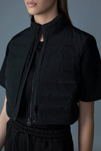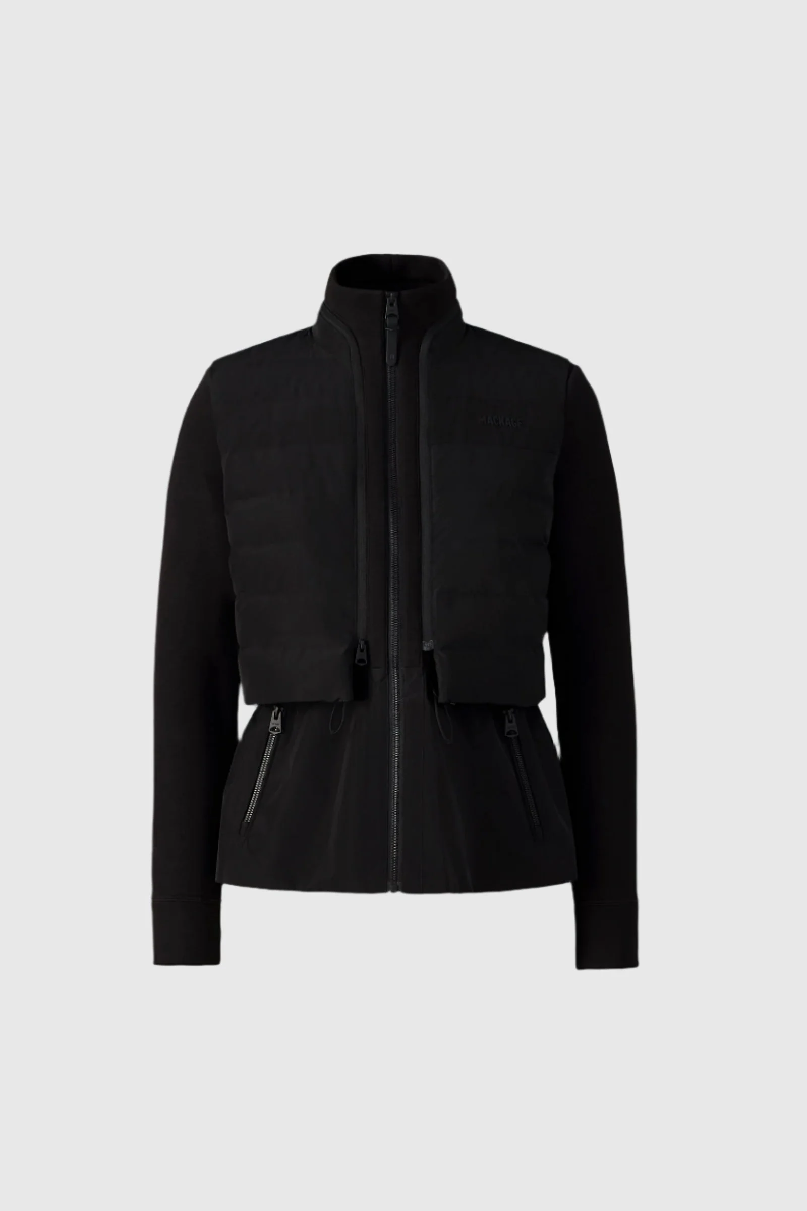 PRISCILLA-Z is a 3-in-1 mixed-media jacket for women featuring a rainwear peplum and recycled lustrous light down front. An expertly tailored indoor-outdoor style, soft double-face jersey accents the sleeves, back, and collar. Perfect for everyday, the drawcord waist lends a custom fit and cinched silhouette. Remove the down vest layer for lighter shell jacket. DETAILS - 3-in-1 mixed-media light down jacket - Made from recycled materials - GRS-certified down fill - Removable down vest - Centre front zipper closure (at vest) - Adjustable bungee at waist (inner layer) - Pockets with zippers (inner layer) - Zipper to connect layers - MACKAGE silicone branding on chest - Rainwear front and back peplum - Machine washable SIZE & FIT - SEMI-FITTED – Follows your body’s shape for ease of movement. - Designed tolayer with a fitted top or light sweater. - The model is 5'11" (180 cm) and wears a size S. - Coat length from shoulder to hem: 23 ¾'' / 60 cm. COMPOSITION & CARE - Shell: 53% cotton, 47% polyester. Combo shell 1: 100% recycled polyester. Lining: 100% recycled polyester. Filling: 90% GRS-certified down, 10% feathers. - Outer shell: Close zippers. Remove all removable trims. Wash inside out. Wash in domestic machine in water not exceeding 30°C at delicate gentle setting. Use mild detergent. Wash with similar colors. Remove immediately after washing. Do not soak. Tumble dry at low heat, until fully dried. Do not wet-clean. Do not bleach. Do not wring. Do not iron or press. Do not dry clean. - Removable liner: Close zippers. Remove fur. Remove all removable trims. Wash inside out. Wash in domestic machine in water not exceeding 40°C, at normal setting. Use mild detergent. Remove immediately after washing. Do not soak. Tumble dry low heat with tennis balls, until fully dried (1 to 3 hours). Do not wet-clean. Do not bleach. Do not wring. Do not iron or press. Dry clean using oil-based solvent only. Do not use perchloroethylene.