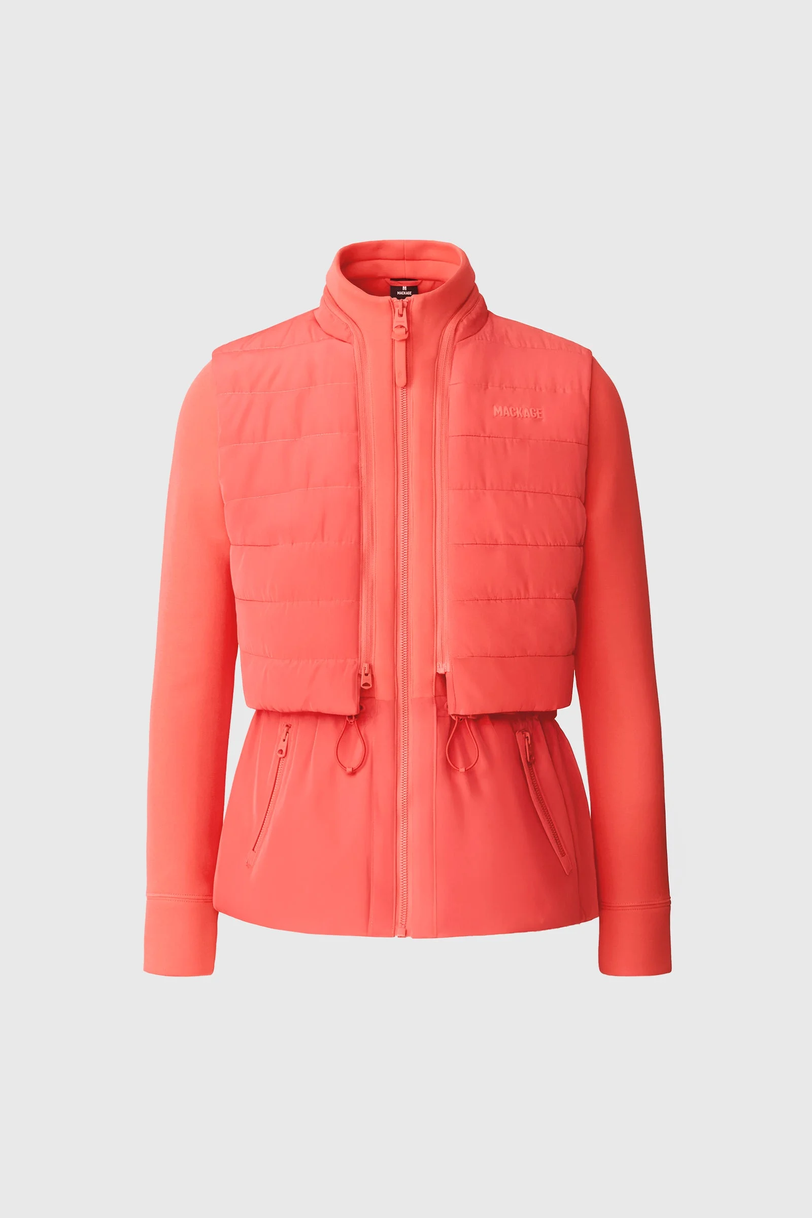 PRISCILLA-Z is a 3-in-1 mixed-media jacket for women featuring a rainwear peplum and recycled lustrous light down front. An expertly tailored indoor-outdoor style, soft double-face jersey accents the sleeves, back, and collar. Perfect for everyday, the drawcord waist lends a custom fit and cinched silhouette. Remove the down vest layer for lighter shell jacket. DETAILS - 3-in-1 mixed-media light down jacket - Made from recycled materials - GRS-certified down fill - Removable down vest - Centre front zipper closure (at vest) - Adjustable bungee at waist (inner layer) - Pockets with zippers (inner layer) - Zipper to connect layers - MACKAGE silicone branding on chest - Rainwear front and back peplum - Machine washable SIZE & FIT - SEMI-FITTED – Follows your body’s shape for ease of movement. - Designed tolayer with a fitted top or light sweater. - The model is 5'11" (180 cm) and wears a size S. - Coat length from shoulder to hem: 23 ¾'' / 60 cm. COMPOSITION & CARE - Shell: 53% cotton, 47% polyester. Combo shell 1: 100% recycled polyester. Lining: 100% recycled polyester. Filling: 90% GRS-certified down, 10% feathers. - Outer shell: Close zippers. Remove all removable trims. Wash inside out. Wash in domestic machine in water not exceeding 30°C at delicate gentle setting. Use mild detergent. Wash with similar colors. Remove immediately after washing. Do not soak. Tumble dry at low heat, until fully dried. Do not wet-clean. Do not bleach. Do not wring. Do not iron or press. Do not dry clean. - Removable liner: Close zippers. Remove fur. Remove all removable trims. Wash inside out. Wash in domestic machine in water not exceeding 40°C, at normal setting. Use mild detergent. Remove immediately after washing. Do not soak. Tumble dry low heat with tennis balls, until fully dried (1 to 3 hours). Do not wet-clean. Do not bleach. Do not wring. Do not iron or press. Dry clean using oil-based solvent only. Do not use perchloroethylene.