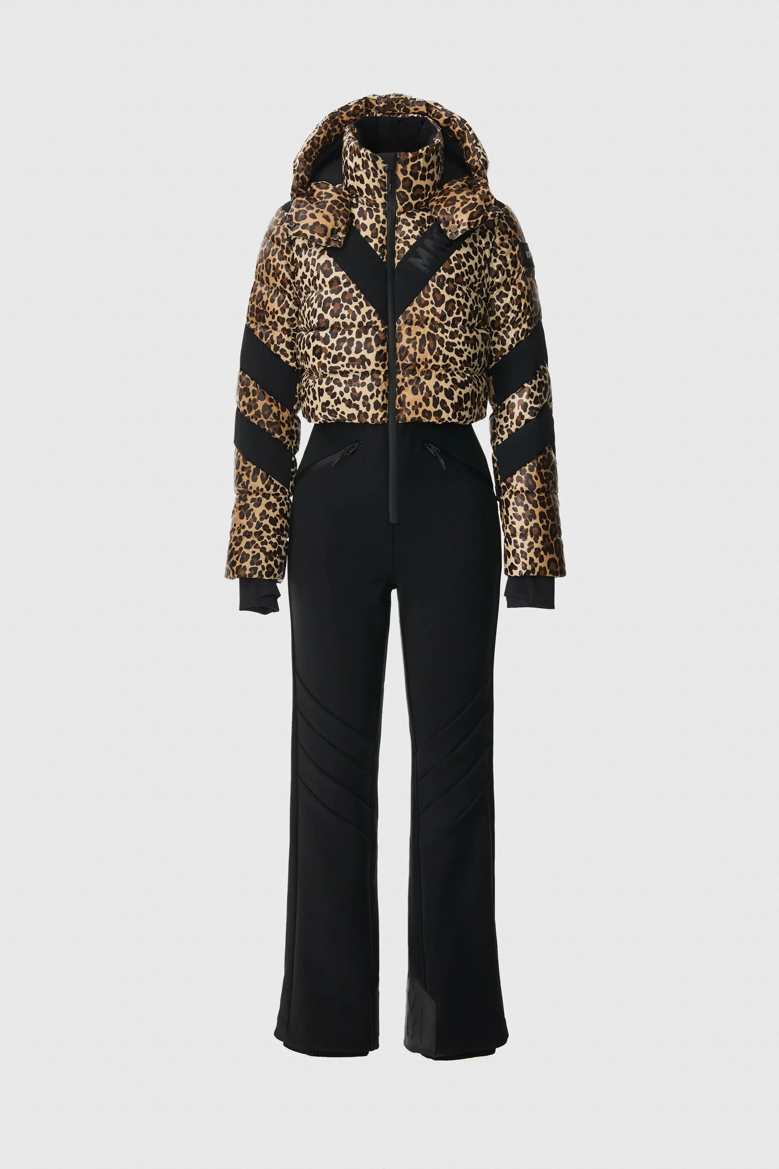SATORY-A is a fitted one-piece ski suit crafted from bonded fleece with mixed-media paneling and animal-print pattern at body. Insulated with responsibly-sourced down, it features a removable hood with adjustable storm visor, full-body snow gaiter, and storm cuffs with thumb loops. Contrast chevron insets and quilted sleeves add a bold finish to this alpine statement. DETAILS - Fitted ski suit - Responsibly-sourced down - Animal print pattern at body - Temperature rating: -20°C - Water-repellent, resistant, and windproof - Water-resistant zippers at center front and pockets - Removable hood with adjustable storm visor - Powder skirt at bottom hem - Adjustable hood opening with bungee cord and stopper - Storm cuffs with thumb loops - Quilted body and sleeves - Zippered ski pass pocket at left sleeve - Zipper opening at bottom hem - Scuff guard at inseam hem - “MACKAGE” branded storm placket and silicone ski patch at left sleeve - MACKAGE logo screen print at chest SIZE & FIT - FITTED – Our signature fit, closest to the body. - Designed to be worn with light layers, all while keeping you warm. - For heavier layering, we recommend sizing up. - The model is 5'11" (180 cm) and wears a size S. - Inseam: 31'' / 64 cm. COMPOSITION & CARE - Shell: 82% polyamide/nylon, 18% elastane/spandex. Lining: 82% recycled nylon, 18% elastane/spandex. Filling: 90% down, 10% feathers. Water-repellent, water-resistant. - Close zippers. Remove fur. Remove all removable trims. Wash in domestic machine in water not exceeding 30°C at delicate gentle setting. Wash inside out. Use mild detergent. Remove immediately after washing. Do not soak. Tumble dry at low heat with tennis balls until fully dried (1 to 3 hours). Do not wet-clean. Do not bleach. Do not wring. Do not iron or press. Do not steam. Do not dry clean.