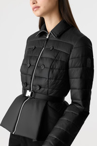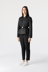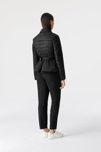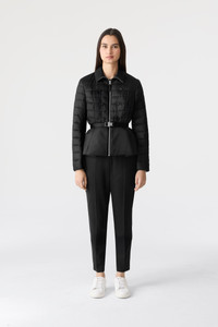SERAFINA is a semi-fitted jacket crafted from ultra-light recycled nylon with DETAILS - Quilted belted jacket - Temperature Rating: 0°C - Water-resistant and repellent - 100% recycled nylon - Primaloft® Silver Insulation - Shirt collar with center front zipper closure - Adjustable belt with buckle - Horn buttons - Quilted body and sleeves - Pleated peplum - Box pleats at center back seam - "M" logo applique on left sleeve - “Aesthetics that protect” logo webbing tape at interior - Machine washable - Semi-fitted SIZE & FIT - SEMI-FITTED – Follows your body’s shape with ease. - Designed to be worn with light layers. - The model is 5'11" (180 cm) and wears a size S. - Coat length from shoulder to hem: 23.75'' / 61 cm. COMPOSITION & CARE - Shell: 100% recycled nylon. Lining: 100% recycled nylon. Filling: 100% recycled polyester. Water resistant, water repellent - Wash inside out. Wash separately in domestic machine in water not exceeding 30°C at delicate gentle setting. Use mild detergent. Do not wet-clean. Iron with steam by hand, at a medium temperature (not exceeding 150°C). Do not tumble dry. Do not bleach. Do not wring. Do not dry clean