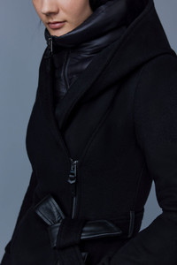 SHIA is a 2-in-1 coat for women featuring the hooded Signature Collar and a removable lustrous light recycled down bib with stand collar. Expertly crafted with double-face wool, a shell and leather sash belt accentuate the fitted asymmetrical zip front. Mixed media details and leather welts add elegant edge. A versatile tri-season staple with high-impact style. - Three-quarter coat with asymmetrical zip closure - Double-face wool - Removable light recycled down bib with stand collar and zip closure - Signature Collar with hood - Leather welt waist pockets - Shell and leather sash belt - Darted tailoring - Fitted silhouette - Made in Portugal SIZE & FIT - FITTED – Our signature fit, closest to the body. - Designed to be worn with light layers, all while keeping you warm. - For heavier layering, we recommend sizing up. - Coat length from shoulder to hem: 39'' / 99.06 cm. COMPOSITION & CARE INSTRUCTIONS - Shell : 100% wool. Combo shell: 100% lamb leather. Lining: 100% polyamide/nylon. Combo Lining: 96% polyester, 4% elastane/spandex. Filling: 90% duck down, 10% feathers. - Dry clean by leather specialist using oil based solvent only. Do not use perchloroethylene.