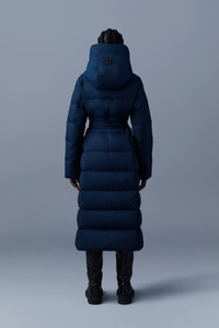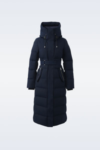 SHYLA is a 2-in-1 longline down coat for women with a removable lustrous down bib and adjustable storm visor hood. Water resistant and repellent, our proprietary Nordic Tech weave and removable branded belt deliver versatile protection and fit. The (R) Leather welt storm placket and hidden drawcord waist add customizable warmth. Expertly tailored for fashion-forward utility. - 2-in-1 longline down coat with removable lustrous light down bib - 800 fill power - Arctic rated: Down to -25°C - Nordic Tech shell - Hood with adjustable storm visor - Center front zip with storm placket - Hidden snaps with (R) Leather welt - Hidden drawcord waist for heat retention - Insulated zip waist pockets - Storm cuffs - Signature M logo on left sleeve - Semi-fitted silhouette SIZE & FIT - SEMI-FITTED – Follows your body’s shape with ease. - Designed to layer with a fitted top or light sweater. - Coat length from shoulder to hem: 45'' / 114.3 cm. COMPOSITION & CARE INSTRUCTIONS - Shell (Woven. In-visible): 59% polyamide/nylon, 41% polyester. Combo (cuffs. Knit. In-visible):42% wool, 42% acrylic, 14% polyester, 2% elastane/spandex. Lining (Woven. In-visible): 100% polyamide/nylon. Filling (Down): 90% chinese white duck down, 10% chinese duck feathers. Water-repellent & water-resistant. - Dry clean by leather specialist using oil based solvent only. Do not use perchloroethylene.