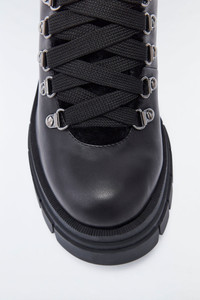 SUMMIT is a water resistant and repellent mid-heel lace-up leather ankle boot for women with shearling lining for extra warmth. An on-trend built-up rubber sole adds traction and edge. An elegant all-weather boot. DETAILS - Lace-up lamb leather ankle boot - Deep Cold: Down to -20°C - Shearling-lined - Mid-heel - logo on back heel - Built-up rubber sole - Loop tab on back shaft - Hook and loop lace up system - M logomark outline embroidery COMPOSITION & CARE - Shell: 100% cow leather. Sole: 100% rubber. Lining: 100% sheep. Water-resistant. - Wash gently by hand