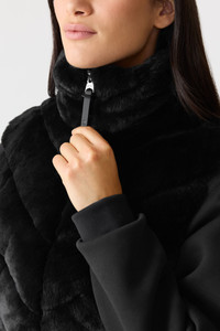 TWIGGY is a lightweight down vest designed with a faux fur shell. Smocked elastic panels and subtle piping details add texture and ease, while hidden zip pockets offer streamlined storage. Perfect for layering through transitional weather. DETAILS - Lightweight quilted down vest - Faux fur shell - Temperature Rating: +5°C - GRS-certified recycled down - Quilted body - 2-way center front zipper closure - Smocked elasticized detail at sides - Inner welt pocket with zipper - Pocket with hidden zipper - Piping detail - Faux fur - Stand collar - Inside front storm placket - Silicone M logo patch - Regular fit SIZE & FIT - SEMI-FITTED – Follows your body’s shape with ease. - Designed to be worn with light layers. - The model is 5'11" (180 cm) and wears a size S. - Coat length from shoulder to hem: 26'' / 66 cm. COMPOSITION & CARE - Shell: 100% polyester. Lining: 100% recycled nylon. Filling: 90% recycled down, 10% recycled feathers. - Dry clean by leather specialist using oil based solvent only. Do not use perchloroethylene.