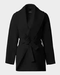 - Mackage "Tyra" double-face wool robe jacket with a sustainable leather and wool sash belt - Approx. 30"L from shoulder to hem - Shawl collar - Wrap front - Long sleeves - Side slip pockets - Tie-belted waist - Back vent - Mid-length - Relaxed fit - Wool/leather - Unlined - Imported - Fashioned for change: responsible manufacturing. Find out more - here - Size Note: Item runs large, consider ordering a size down.