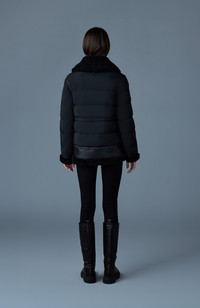VANNA is a mixed-media recycled quilted down jacket with plush shearling detailing throughout. Water-resistant and repellent, a spread collar and leather tape detailing add striking lines to the regular cut. Expertly tailored, a hybrid winter staple with a contemporary design. DETAILS - Mid-length mixed media quilted down jacket - Shearling-trimmed spread collar - Shearling trim around back yoke, sleeve, sleeve hems and bottom hem - Leather trim details - Center front zip closure with leather tape - Insulated zip waist pockets - Signature M logo patch on left sleeve - Collar tab with snaps - Zipper vent at sleeve cuffs - Inside adjustable drawcord at back waist - Regular fit - Down to -15°C SIZE & FIT - REGULAR – Classic fit allowing comfort and style. - Designed to be worn with heavier layers. - The model is 5'11" (180 cm) and wears a size XS. - Coat length from shoulder to hem: 26.5'' / 67 cm. COMPOSITION & CARE - Shell: 82% recycled nylon, 18% elastane/spandex. Combo shell: 100% sheepskin. Lining: 82% recycled nylon, 18% elastane/spandex. Filling: 90% duck down, 10% feathers. Water-repellent and water-resistant. - Dry clean by leather specialist using oil-based solvent only. Do not use perchloroethylene.