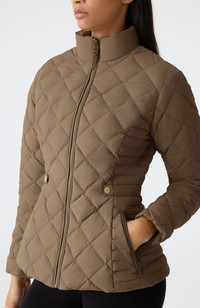 VIK is a fitted diamond quilted jacket crafted from a high-performance stretch shell. Engineered with down and GRS certified recycled fill, it delivers warmth without bulk. Functional details include an adjustable waist tab at the back with snaps, a stand collar, and elasticized cuffs for a snug fit. A sleek, versatile silhouette designed for transitional layering. DETAILS - Fitted diamond quilted down jacket - Stretch shell - GRS-certified recycled down - Center front zipper closure - Inner welt pocket with zipper - Adjustable waist tab at back with snaps - Stand collar - Elasticized cuffs - Quilted body and sleeves - Fully lined - “Mackage” silicone logo at hem (outer layer) - Temperature rating: -5°C SIZE & FIT - FITTED – Our signature fit, closest to the body. - Designed to be worn with light layers, all while keeping you warm. - For heavier layering, we recommend sizing up. - The model is 5'11" (180 cm) and wears a size S. - Coat length from shoulder to hem: 25'' / 65 cm. COMPOSITION & CARE - Shell: 82% recycled nylon, 18% elastane/spandex. Lining: 82% recycled nylon, 18% elastane/spandex. Filling: 85% recycled down, 15% recycled feathers. Water-repellent, water-resistant. - Close zippers. Remove fur. Remove all removable trims. Wash inside out. Wash in domestic machine in water not exceeding 40°c, at normal setting. Use mild detergent. remove immediately after washing. Do not soak. Tumble dry low heat with tennis balls, until fully dried (1to 3 hours). Do not wet-clean. Do not bleach. Do not wring. Do not iron or press. Dry clean using oil based solvent only. Do not use perchloroethylene.