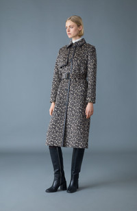 ZEVA-A is a long single-breasted wool coat with animal print pattern throughout. Crafted from a blend of alpaca wool and finished with refined leather tape detailing, this statement coat features an adjustable belt with buckle to cinch the waist and welt pockets for utility. Fully lined for comfort and warmth, rated for temperatures down to -5°C. DETAILS - Long single-breasted wool coat - Responsibly-sourced wool - Leather tape detailing - Adjustable belt with buckle - Button front closure - Welt pockets - Fully lined - Vent opening at back with button - Temperature rating: -5°C SIZE & FIT - SEMI-FITTED – Follows your body’s shape with ease. - Designed to be worn with light layers. - The model is 5'11" (180 cm) and wears a size S. - Coat length from shoulder to hem: 45.5'' / 69 cm. COMPOSITION & CARE - Shell: 70% wool, 20% alpaca, 10% polyamide/nylon. Lining: 52% polyester, 48% viscose. - Dry clean by leather specialist using oil based solvent only. Do not use perchloroethylene.