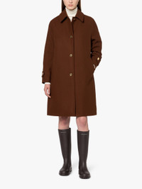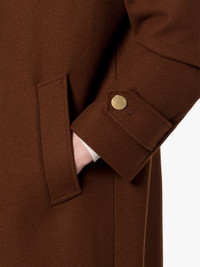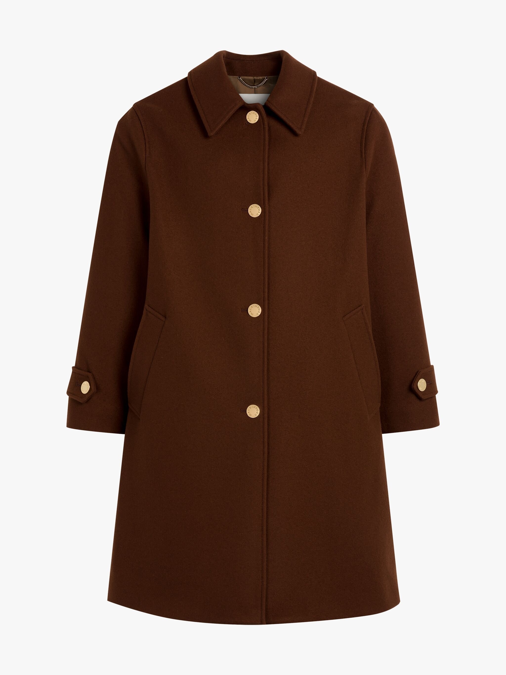 Description A time-tested silhouette, the wool Banton coat is tailored in our factory in the United Kingdom to a sleek A-line design. Signature Mackintosh design details – including the detachable throat latch and cuff adjusters – elevate the otherwise simple design. Size & Fit Model is 176cm and wears size UK8 Details & Care Banton Brown Wool 3/4 Coat Dark brown Point collar Detachable throat latch with button fastening Long sleeves with button adjusters at cuffs Slip side pockets Single back vent Internal hanging chain loop Button front fastening Regular fit 100% wool; lining: 100% cupro Fabric weight: 630g m (150cm) Dry clean only Made in the United Kingdom Style ID: MO9025 Model: BANTON BT MB LM-1151F/WO 2K09