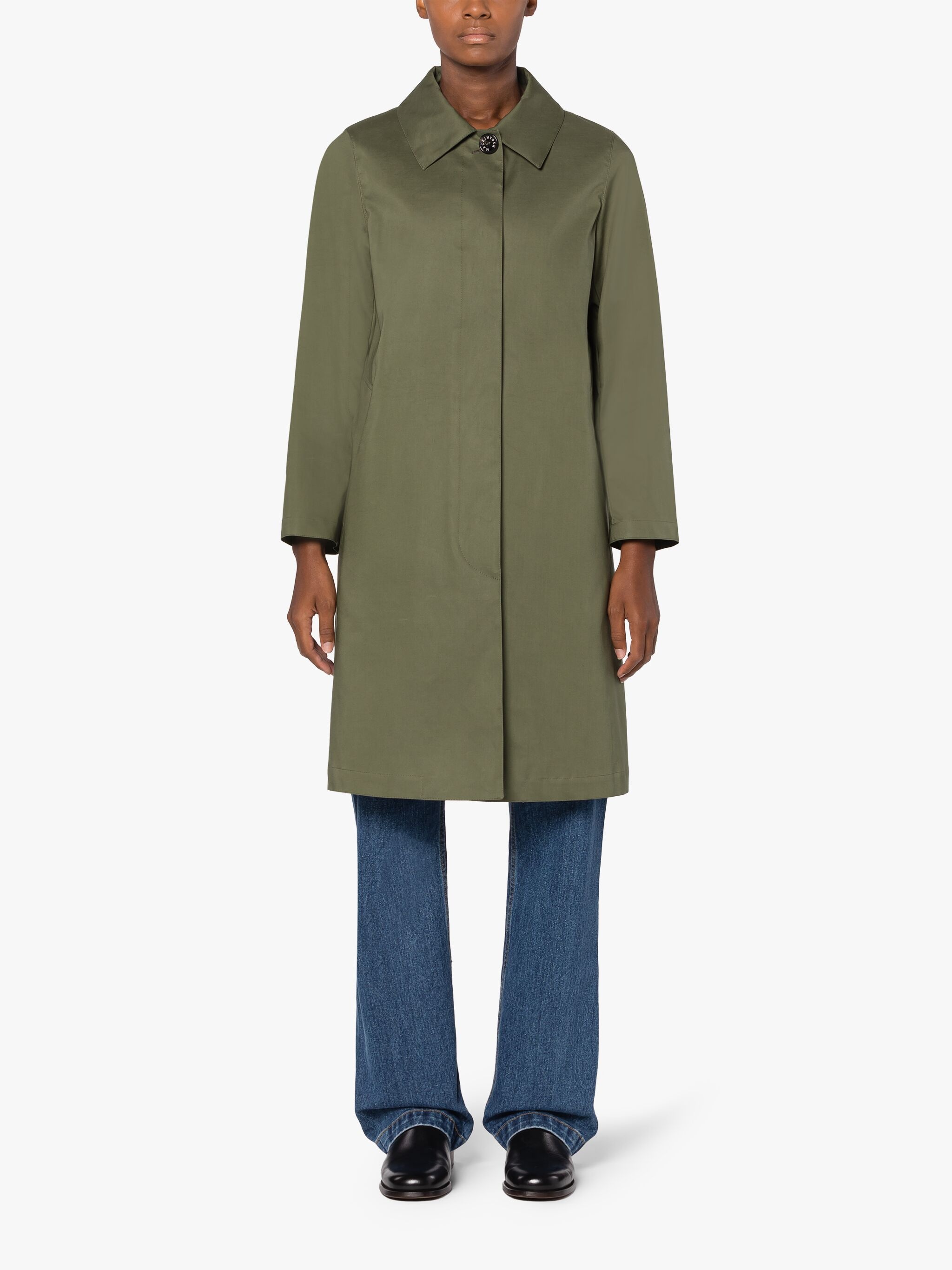 Description The Banton coat is tailored in the United Kingdom to a sleek A-line silhouette from RAINTEC cotton, favoured for its water-repellent, windproof and breathable qualities. Rendered in a green hue, it can be fitted with one of the collection's interchangeable liner vests for additional insulation. Size & Fit Model is 176cm and wears size 8 Consult our size guide for further information Details & Care Banton Green RAINTEC Cotton Coat Four leaf clover green Water-repellent Point collar Long sleeves Slip side pockets Internal tab with press-stud fastening for interchangeable liner vest Internal phone pocket with button fastening Unlined Concealed button front fastening Relaxed fit 100% cotton Dry clean only Made in the United Kingdom Style ID: MO8700 Model: BANTON LM-1057 MIDJ126
