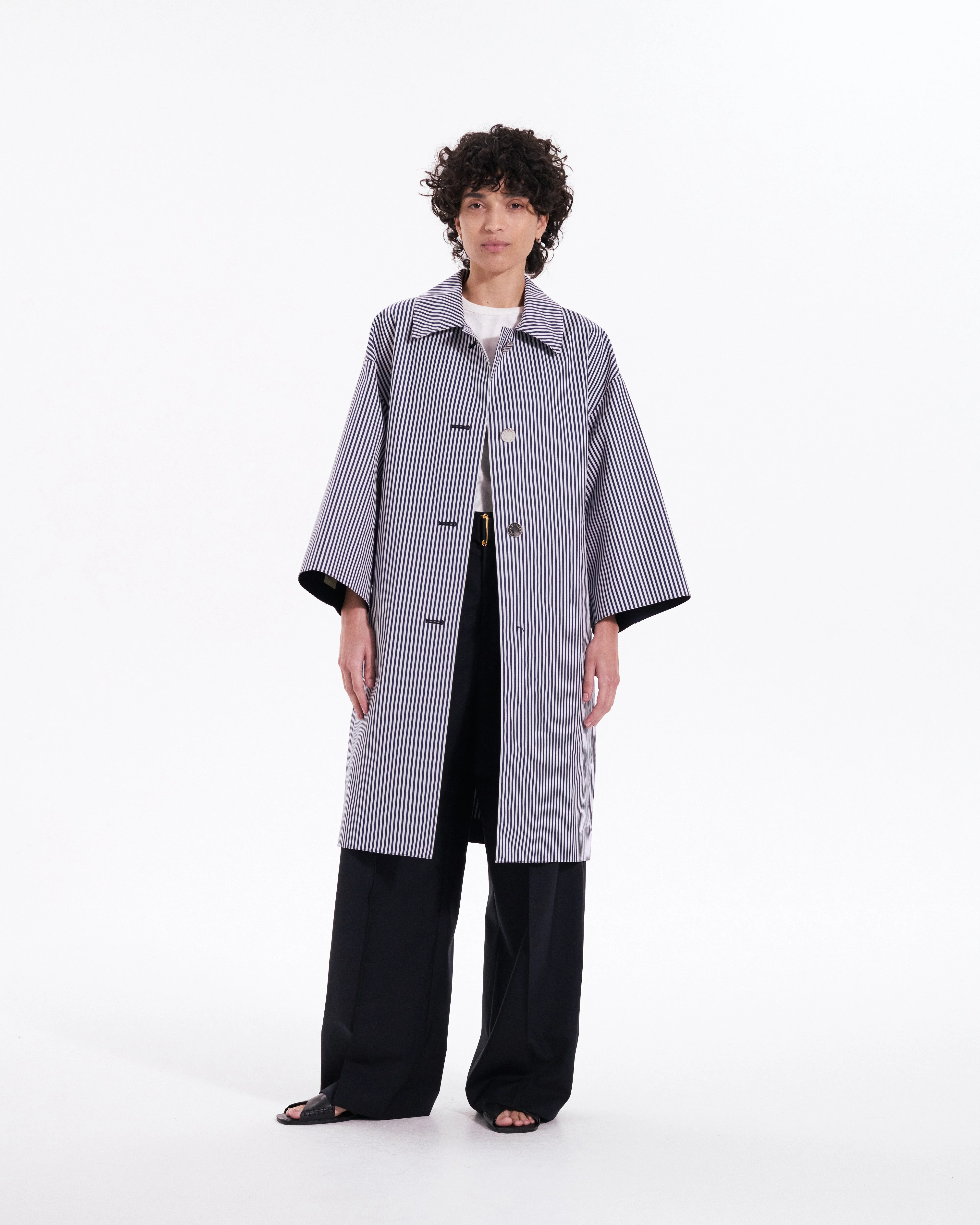 This coat offers a feminine impression with its cropped sleeves and cocoon silhouette. It's a striking piece that features a stripe pattern, accented by its minimalist design and metallic details. Attributes: Cropped sleeve. Cocoon slihouette Item code: OC1863 SIZE & FIT Fit: Oversized Advice: Fits large, size down. Model: Santana is wearing a UK size 8. Height: 176cm. Bust: 78cm. Waist: 60cm. Hips: 87cm FABRIC & CARE Composition: 100% Cotton Washing: Gentle wet clean. Do not dry clean. Do not machine wash.