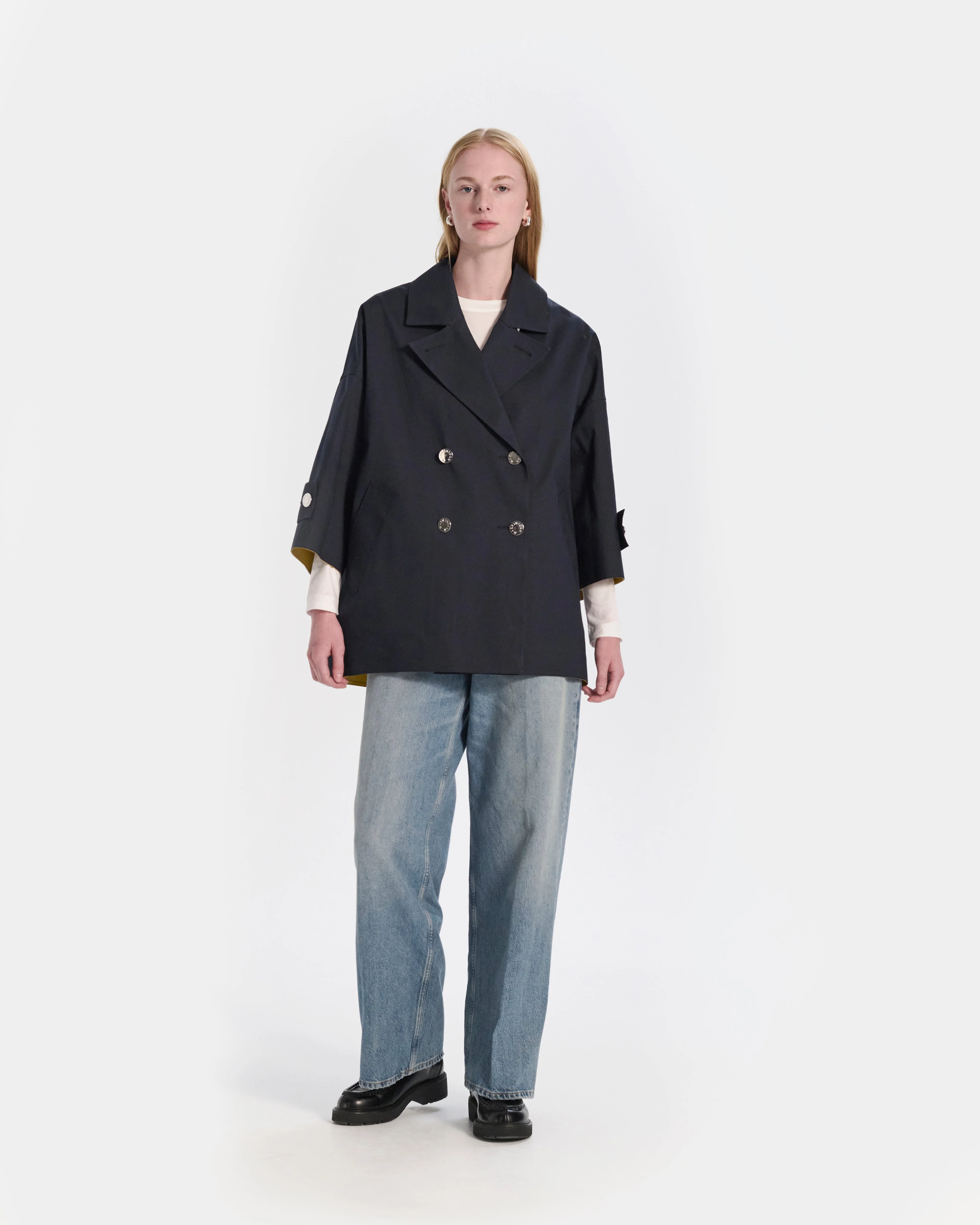 The oversized, elegant cocoon design of this cropped-style coat is easily worn. With standout silver button detailing, the coat is undeniably stylish whilst also being made from the famed Mackintosh rubberised cotton making it completely waterproof, with hand-taped seams to keep wet weather out. Made in: Handmade in Scotland Fabric: Rubberised bonded cotton Attributes: Waterproof windbreaker. Hand-taped seams. Suitable for 3 seasons Detailing: Elegant, cocoon design. Cropped-style coat. Metal buttons with branded logo Item code: RO6563 SIZE & FIT Fit: Oversized Model: Holly is wearing a UK size 8. Height: 179cm. Dress size: UK 6. Bust: 79cm. Waist: 60cm. Hips: 89cm FABRIC & CARE Composition: 100% Cotton Bonded Washing: Spot clean only. Do not machine wash. Do not dry clean. Day to day: Small marks can be removed with soap and water. Apply soap with a soft brush only. Never use spirit or any other chemical cleaners.