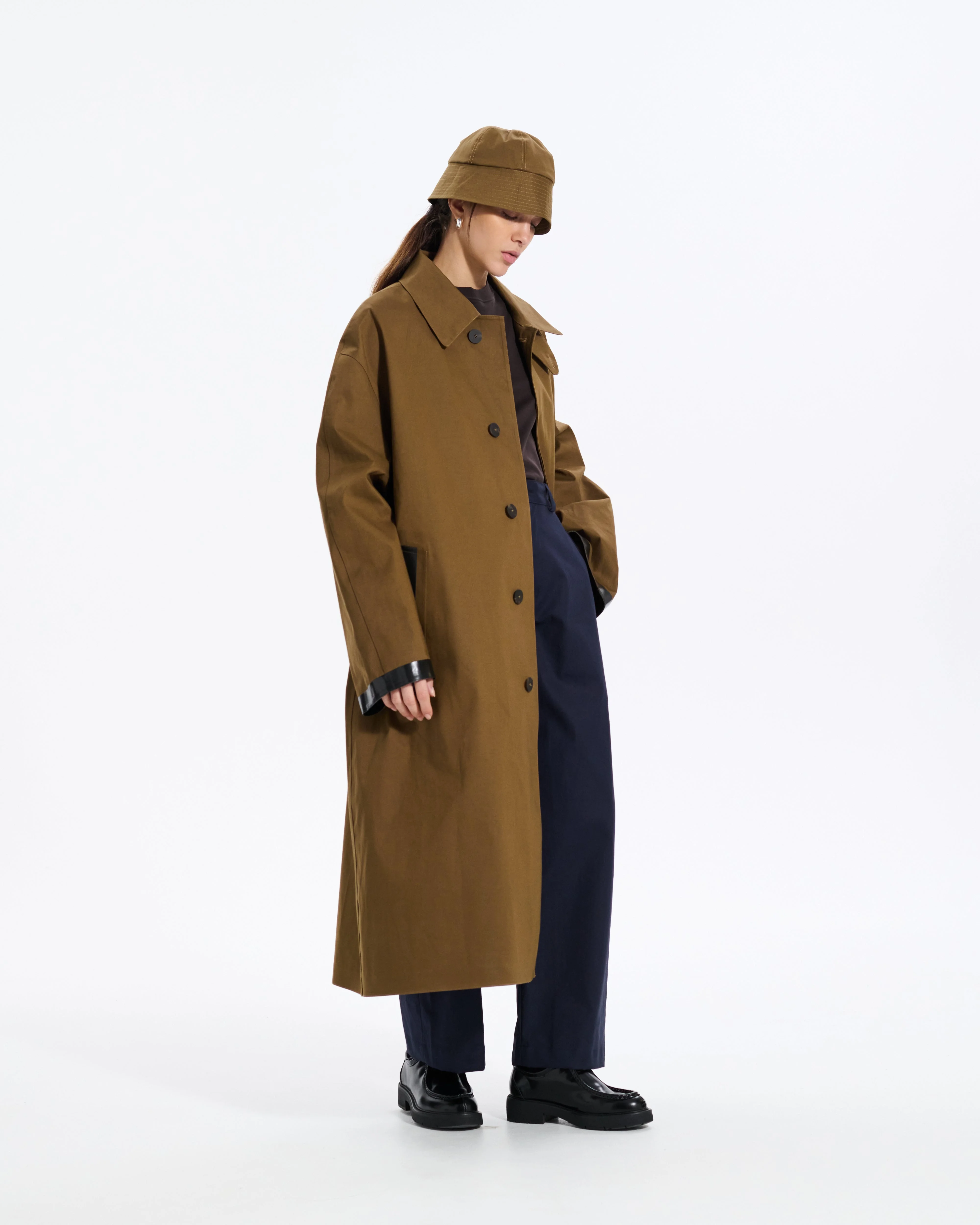 An ode to the best of British craftsmanship, Studio Nicholson’s collaboration with Mackintosh sees Ettrick produced as a contemporary update on the classic knee-length raincoat. Handcrafted in Scotland by a skilled artisan, it’s made from Mackintosh’s signature rubberised bonded cotton: a hard-wearing fabric comprised of two layers of high-quality cotton bonded together to create a fully waterproof finish. Shaped to a generous oversized frame that recalls SN’s modern approach to cut, Ettrick is finished with black hand-taped seams and a button-fastening throat guard for extra protection from the elements. Made in: Handmade in Scotland Fabric: Rubberised bonded cotton Attributes: Waterproof. Windproof. Taped seams Detailing: Button-fastening throat guard. Concealed button placket. Welt pockets. Hand-taped seams. Back vent Item code: RO6712 SIZE & FIT Fit: Oversized Model: Thais is wearing a UK size M. Height: 176cm. Dress size: UK 6. Bust: 77cm. Waist: 58cm. Hips: 87cm FABRIC & CARE Composition: 100% Cotton Bonded Washing: Spot clean only. Do not machine wash. Do not dry clean. Day to day: Small marks can be removed with soap and water. Apply soap with a soft brush only. Never use spirit or any other chemical cleaners.