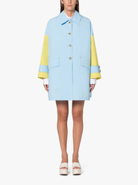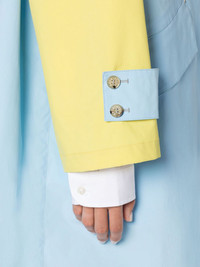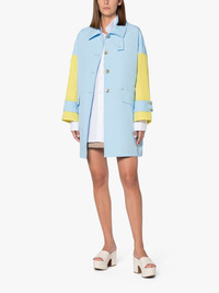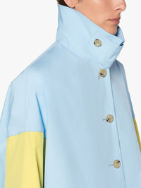 Description A modern approach to the Mackintosh archives, the Humbie coat is cut from sky-blue ECO DRY fabric to a wide A-line silhouette with contrast yellow sleeves and chunky button adjusters at the cuffs. It's immaculately constructed in the United Kingdom and fitted with design signatures – spot the internal phone pocket and tab for attaching a liner vest. Size & Fit Model is 176cm and wears UK size 8 Consult our size guide for further information Details & Care Humbie Blue x Yellow ECO DRY Overcoat Sky blue, bright yellow Water-repellent Point collar Detachable throat latch with button fastening Long sleeves with button adjusters at cuffs Flap side pockets Internal tab with press-stud fastening for interchangeable liner vest Internal phone pocket with button fastening Button front fastening Oversized fit 60% recycled polyethylene, 40% polyethylene Dry clean only Made in the United Kingdom Style ID: MO8018 Model: HUMBIE LMM-015 AGN12/AGN13