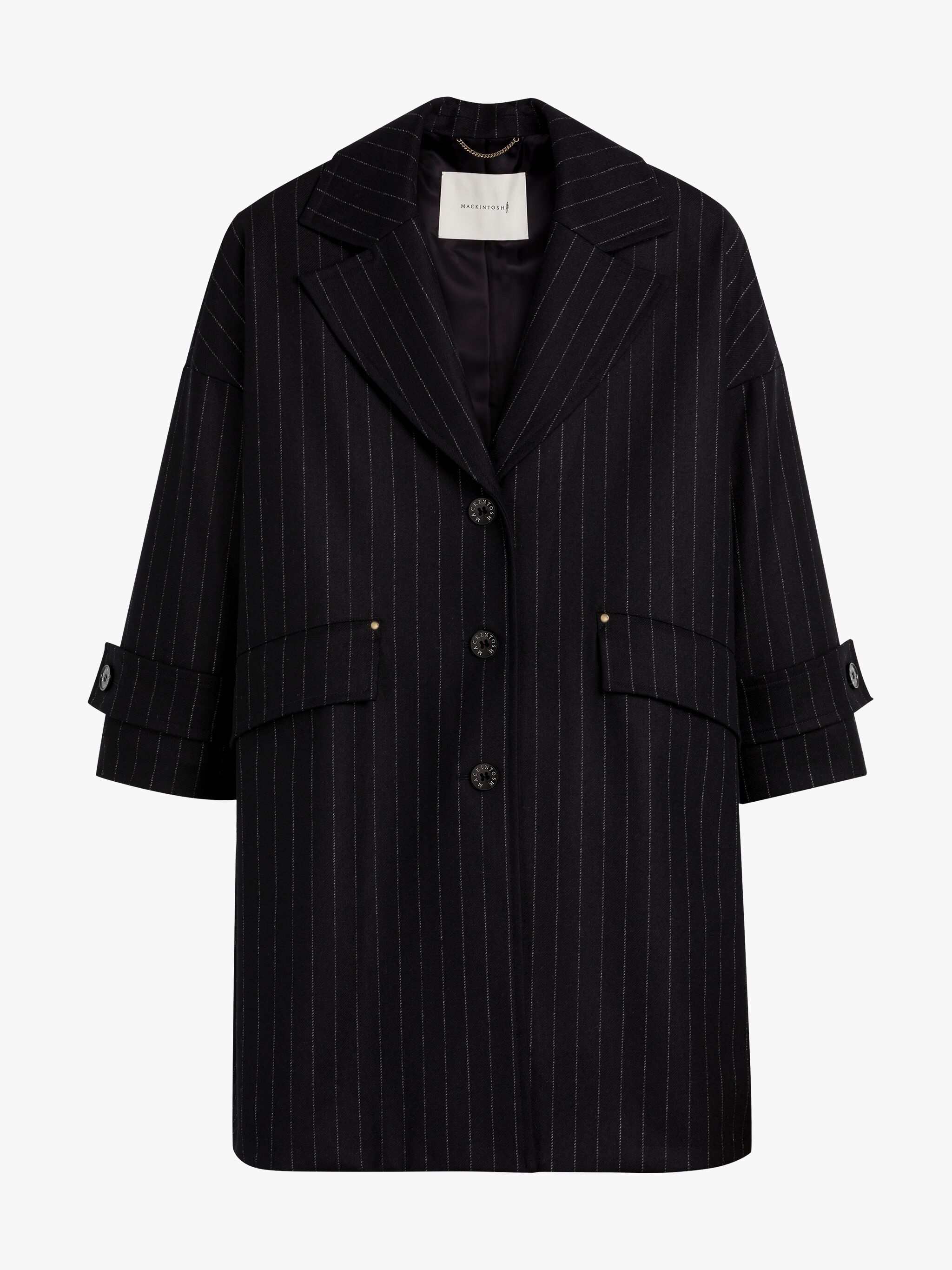 Description A celebration of outerwear heritage with a modern approach, the Humbie is reimagined as a Chester coat with a cocoon silhouette and wide lapels. It’s crafted in our factory in the United Kingdom from navy wool with a Chalk stripe pattern, nodding to Mackintosh’s British roots. Size & Fit Model is 176cm and wears size UK8 Details & Care Humbie Chester Navy Chalkstripe Wool Overcoat Navy blue, white Wide notch lapels Drop shoulders Long sleeves with button adjusters at cuffs Flap side pockets Internal hanging chain loop Button front fastening Oversized fit 100% wool; lining: 100% cupro Fabric weight: 540g m (148cm) Dry clean only Made in the United Kingdom Style ID: MO8930 Model: HUMBIE CHESTER COCOON LM-1149F/WO AKT01