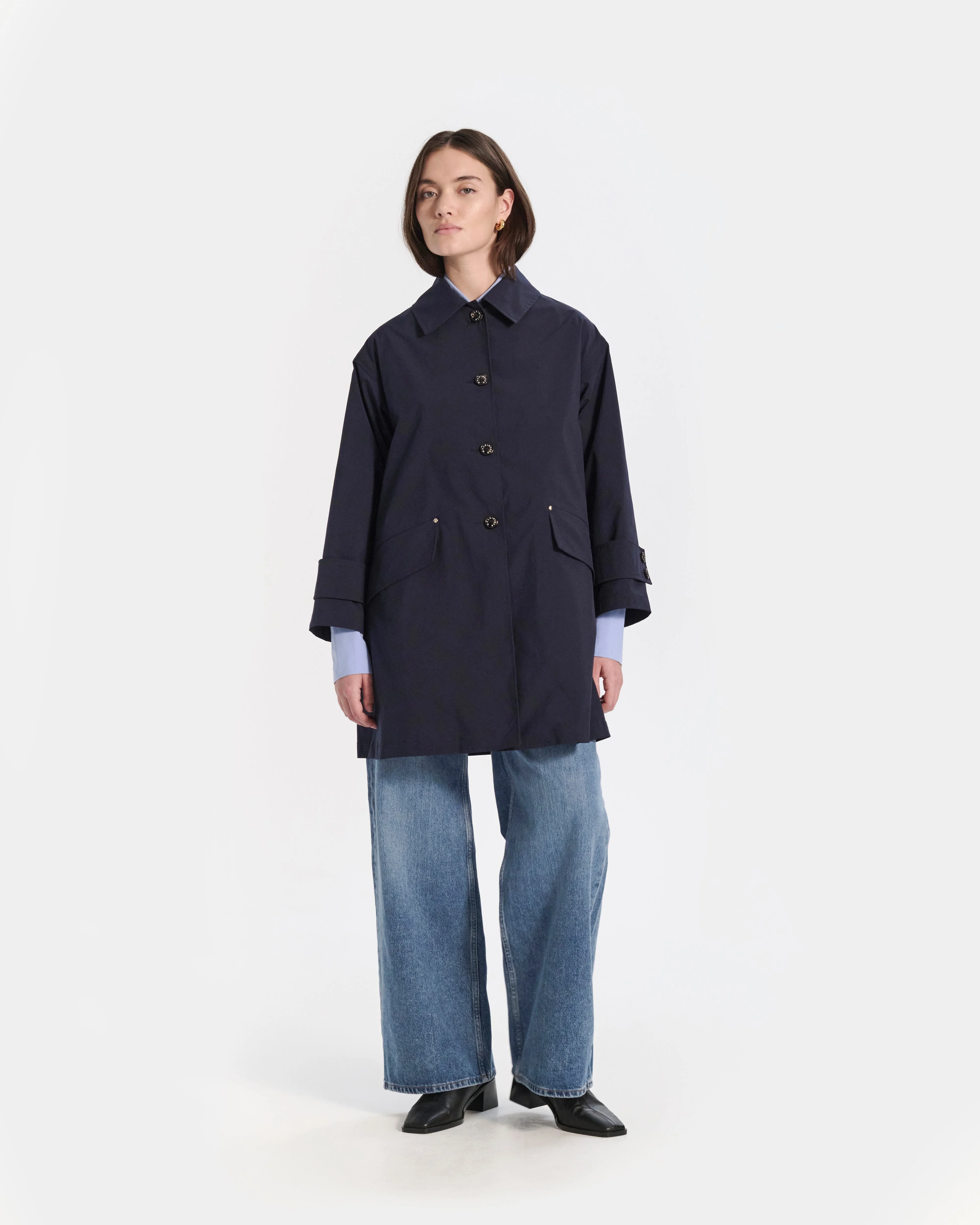 This version of the Humbie coat, comes in a shorter style shape, offering a flatteringly flared A-line shape, with an off-shoulder stainless steel collar. Made from 60% recycled materials, the fabric is highly water-repellent whilst remaining lightweight for everyday wear. Fabric: 60% recycled polyester Attributes: Water repellent fabric. Chin & sleeve tab. Made from 60% recycled materials Detailing: A-line silhouette. Off-shoulder steel collar. Flap pocket with rivets Item code: MO9153 SIZE & FIT Fit: Regular Model: Jensen is wearing a UK size 8. Height: 170cm. Dress size: UK 6. Bust: 86cm. Waist: 62cm. Hips: 93cm FABRIC & CARE Composition: 100% PE (RECYCLE 60%) Washing: Dry clean only Day to day: Do not machine wash. Do not bleach. Do not tumble dry. Warm iron over damp cloth. Gentle dry clean. Do not wet clean