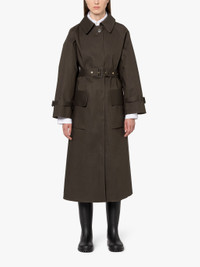 Description Nodding to military codes, the Kelvin trench coat boasts a classic belted silhouette with squared patch pockets and metallic eyelet embellishments. It’s meticulously handcrafted in Scotland from waterproof bonded wool using the same techniques Mackintosh pioneered in the early 19th century. Size & Fit Model is 176cm and wears size UK8 Details & Care Kelvin Chocolate Bonded Wool Trench Coat Cedar brown Waterproof Point collar Long raglan sleeves with buckle adjusters at cuffs Flap side pockets Storm flap at back Back vent Fully taped seams Concealed button front fastening Regular fit 100% wool (bonded); lining: cotton Fabric weight: 373g / ㎡ Do not wash or dry clean Handmade in Scotland Style ID: RO6515 Model: KELVIN LR-1050 IDJ10