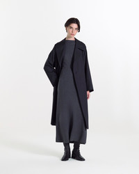 A model that reconstructs a men's military coat into a gown coat that exudes a feminine and elegant mood. This piece has a clean, minimalist design and stands out for its quality materials and tailoring. Made in: Japan Fabric: Attributes: Water repellent Detailing: Waist belt. Slit pockets. Chest pocket Item code: OC0990 SIZE & FIT Model: Candice is wearing a UK size 8. Height: 178cm. Dress size: UK 6. Bust: 81cm. Waist: 61cm. Hips: 88cm FABRIC & CARE Composition: 100% Wool