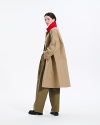 A balmacaan coat with a loose and beautiful A-line silhouette. The minimal design is accented with the colour scheme on the back of the collar and inside the coat. Comes with a removable Harris Tweed liner for all-season wear. Made in: Handmade in Scotland Attributes: Waterproof. Windproof Detailing: Removable neck latch. Harris Tweed Detachable lining. Concealed button placket Item code: RO6641 SIZE & FIT Model: Lottie is wearing a UK size 8. Height: 176cm. Dress size: UK 6. Bust: 76cm. Waist: 61cm. Hips: 92cm FABRIC & CARE Composition: 100% Cotton Bonded Washing: Spot clean only. Do not machine wash. Do not dry clean. Day to day: Small marks can be removed with soap and water. Apply soap with a soft brush only. Never use spirit or any other chemical cleaners.
