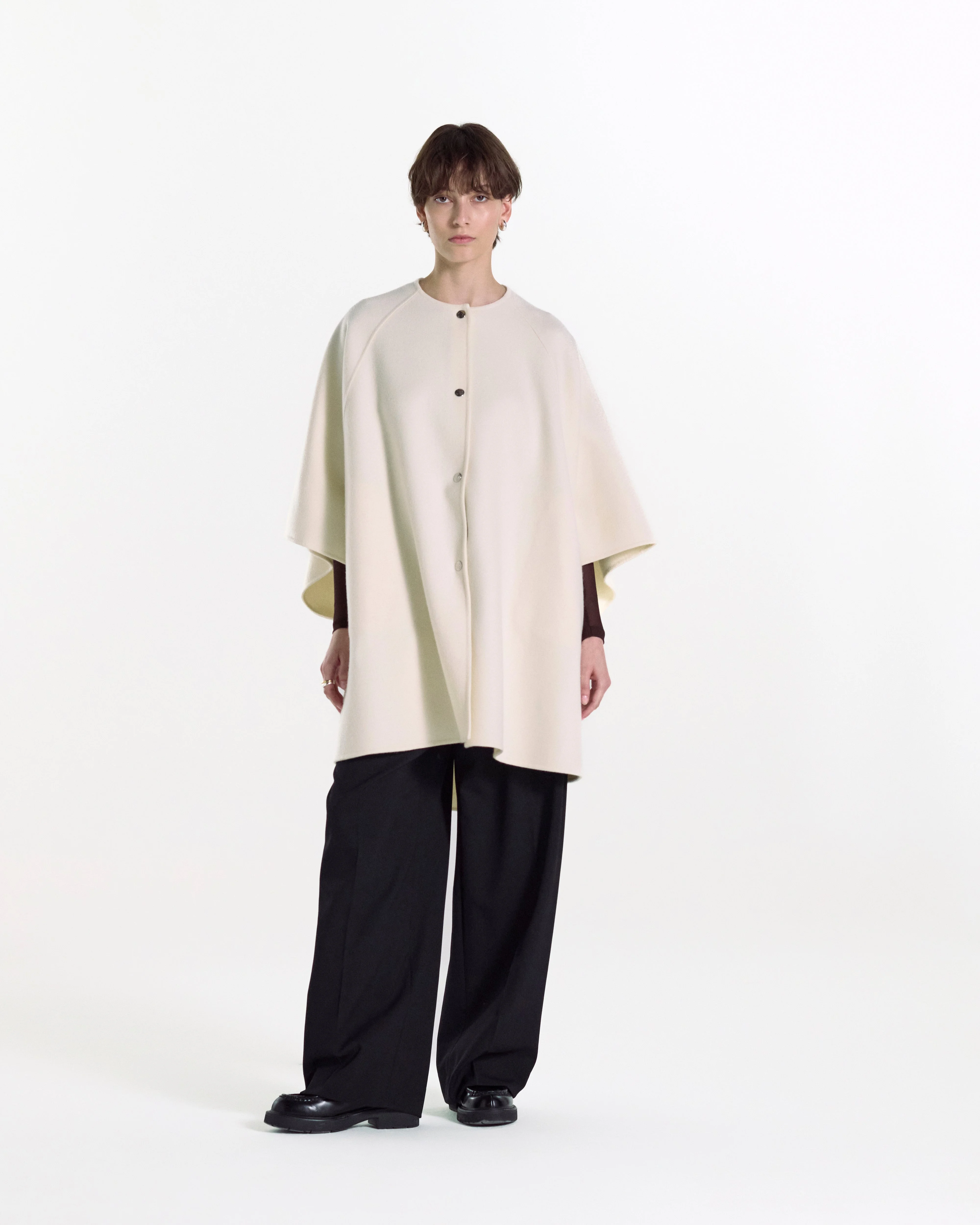 A handmade cape coat made from high quality double-faced material. It has a minimalist design that is light and comfortable, has a beautiful drape, and shows off its high-quality tailoring. Made in: Japan Fabric: Wool Attributes: Handmade Detailing: Pockets. Button fastening Item code: OC1012 SIZE & FIT Model: Carol is wearing a UK size 8. Height: 176cm. Dress size: UK 6. Bust: 77cm. Waist: 60cm. Hips: 87cm FABRIC & CARE Composition: 100% Wool