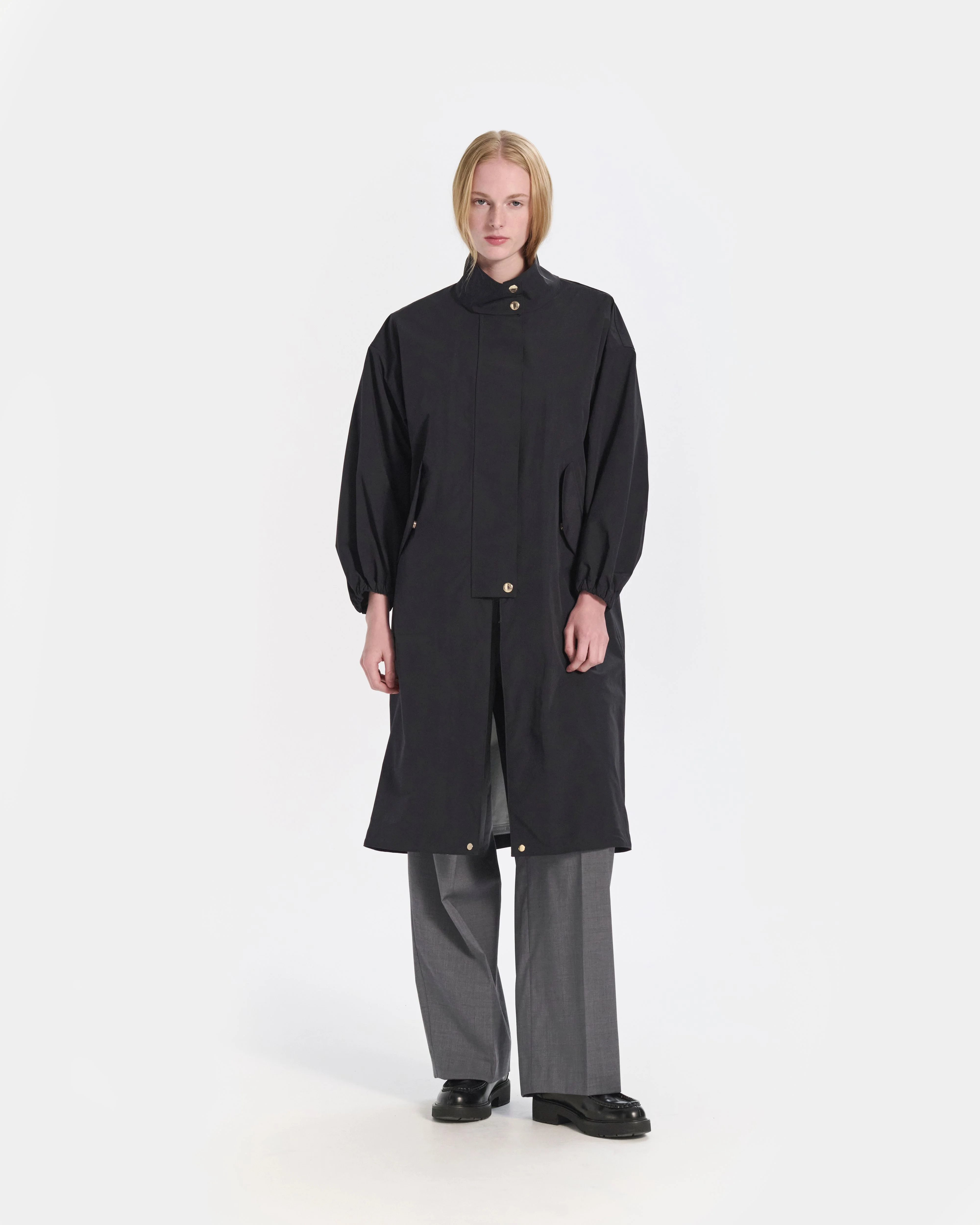 This piece is a military M65 inspired coat, with stylish feminine features that make it more appealing for a modern audience including a classic A-line silhouette, puff sleeves and stand-up collar. The coat also has a functional two-way design that allows you to adjust the length so that it can also be worn as a blouson. Fabric: 100% recycled nylon Attributes: Water resistant. Breathable fabric. Hand-taped seams Detailing: Puff sleeves. Dot buttons with branded logo. Stand-up collar Item code: OC0557 SIZE & FIT Fit: Regular Model: Holly is wearing a UK size 8. Height: 179cm. Dress size: UK 6. Bust: 79cm. Waist: 60cm. Hips: 89cm FABRIC & CARE Composition: 100% RECYCLED NYLON Washing: Dry clean only