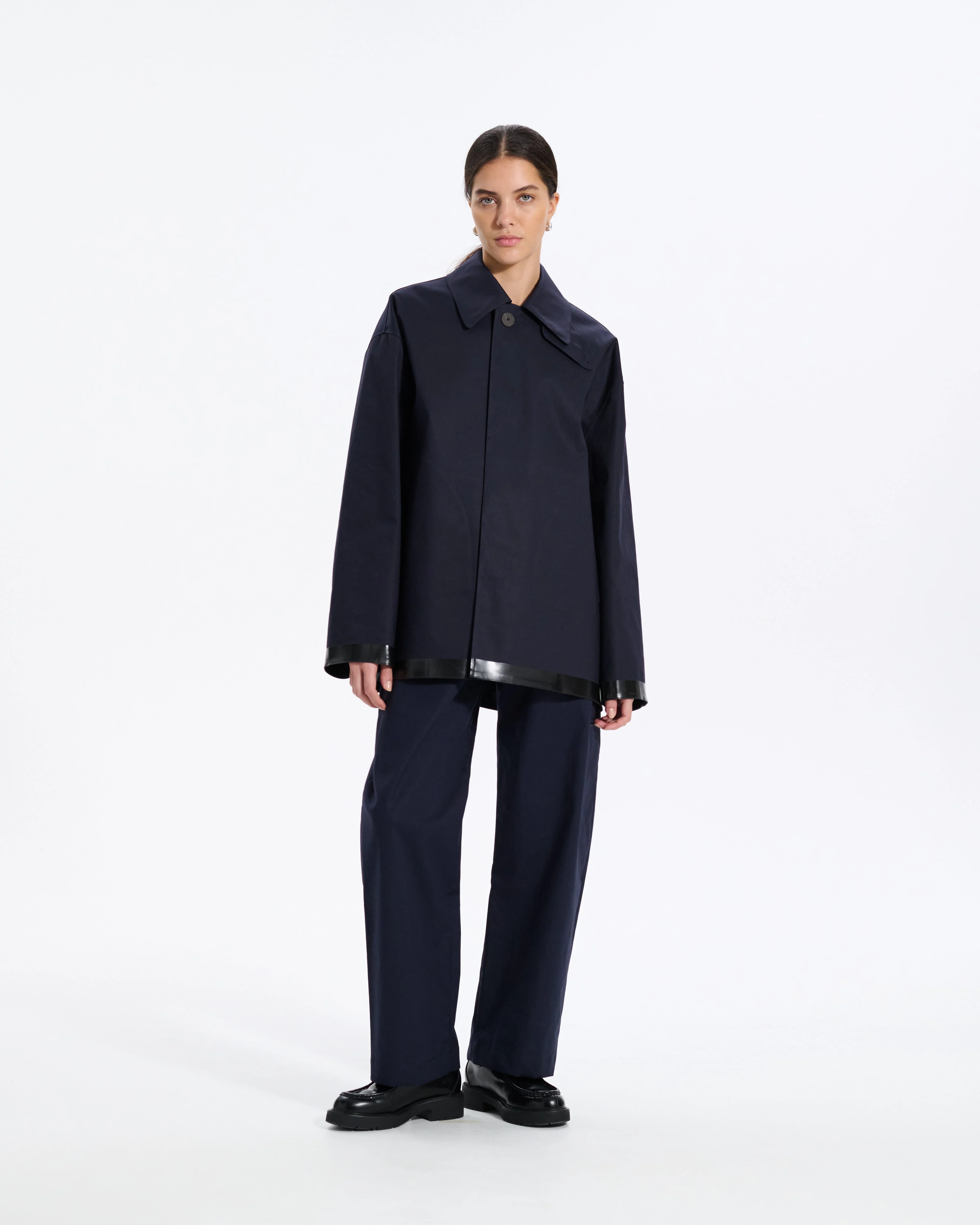 Studio Nicholson joins forces with Mackintosh to celebrate the best of British craftsmanship and create this Teviot coat as part of a 4-piece capsule collection. Handcrafted in Scotland by a skilled artisan, it’s made from Mackintosh’s signature rubberised bonded cotton: a hard-wearing fabric comprised of two layers of high-quality cotton bonded together to create a fully waterproof finish. Shaped to a generous oversized frame and cut at the waist, Teviot is finished with black hand-taped seams and a button-fastening throat guard for extra protection from the elements. Made in: Handmade in Scotland Fabric: Rubberised bonded cotton Attributes: Waterproof. Windproof. Taped seams Detailing: Button-fastening throat guard. Concealed button placket. Welt pockets. Hand-taped seams Item code: RO6714 SIZE & FIT Fit: Oversized Advice: Classic Studio Nicholson oversized fit. Model: Thais is wearing a UK size M. Height: 176cm. Dress size: UK 6. Bust: 77cm. Waist: 58cm. Hips: 87cm FABRIC & CARE Composition: 100% Cotton Bonded Washing: Spot clean only. Do not machine wash. Do not dry clean. Day to day: Small marks can be removed with soap and water. Apply soap with a soft brush only. Never use spirit or any other chemical cleaners.