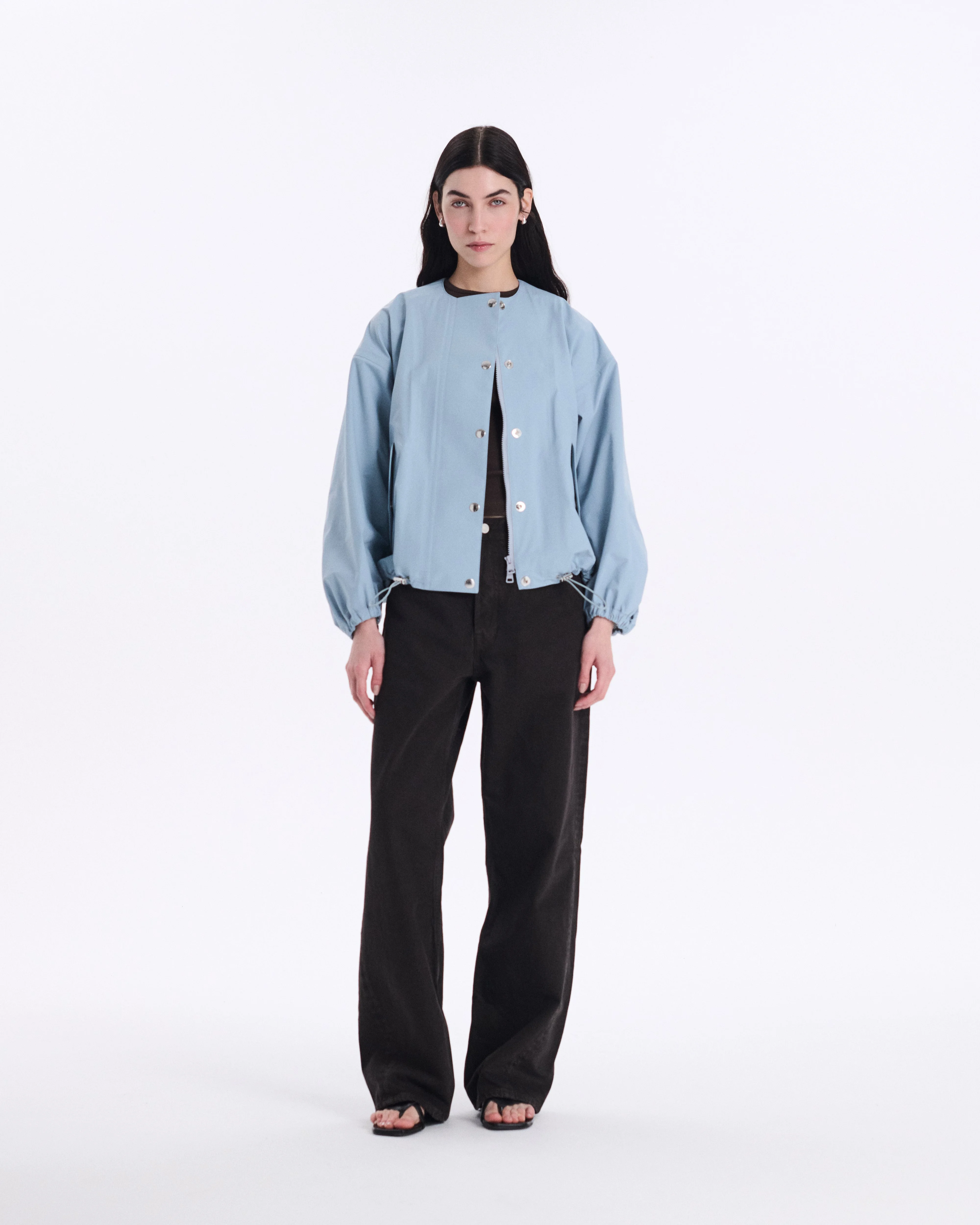 This is a drop-shoulder, collarless blouson. It features a striking feminine A-line silhouette and puff sleeves, with a drawstring hem allowing for adjustable shaping. The outer fabric uses a moisture-permeable and waterproof material, making this piece a blend of both functionality and design. Made in: Japan Item code: OC2047 SIZE & FIT Fit: Regular Model: Polina is wearing a UK size 8. Height: 176cm. Bust: 80cm. Waist: 62cm. Hips: 88cm FABRIC & CARE Composition: 100% Recycled Nylon Washing: Dry clean only