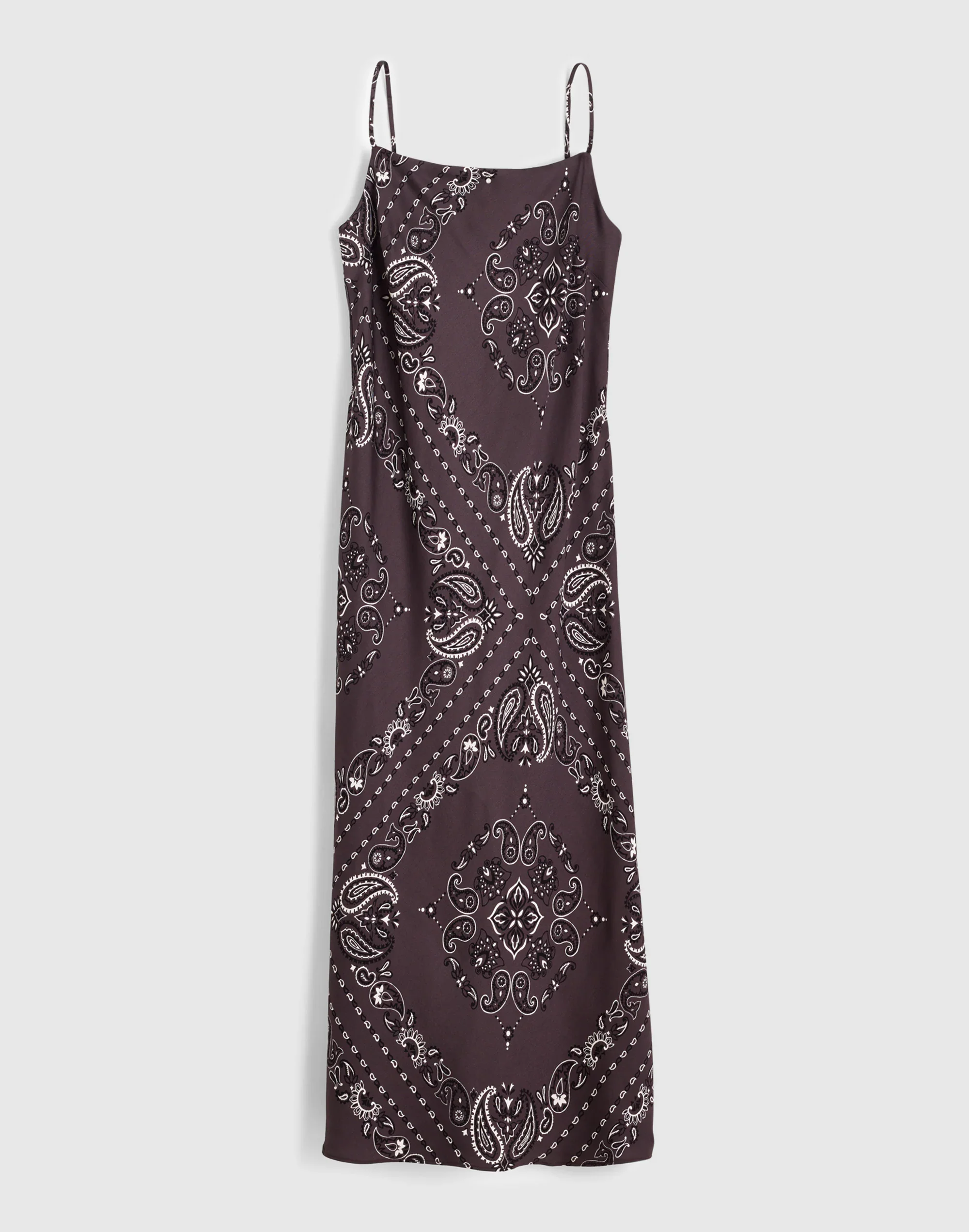 Coming in satin-back crepe, this bandana-print midi slip dress feature adjustable cami straps and a modern square neckline. It's western inspired with a touch of everyday elegance. - Regular fit. - Length from high point of shoulder: 50" size 6. - 100% viscose. - Machine wash. - Imported. - Select stores. - Item NZ430