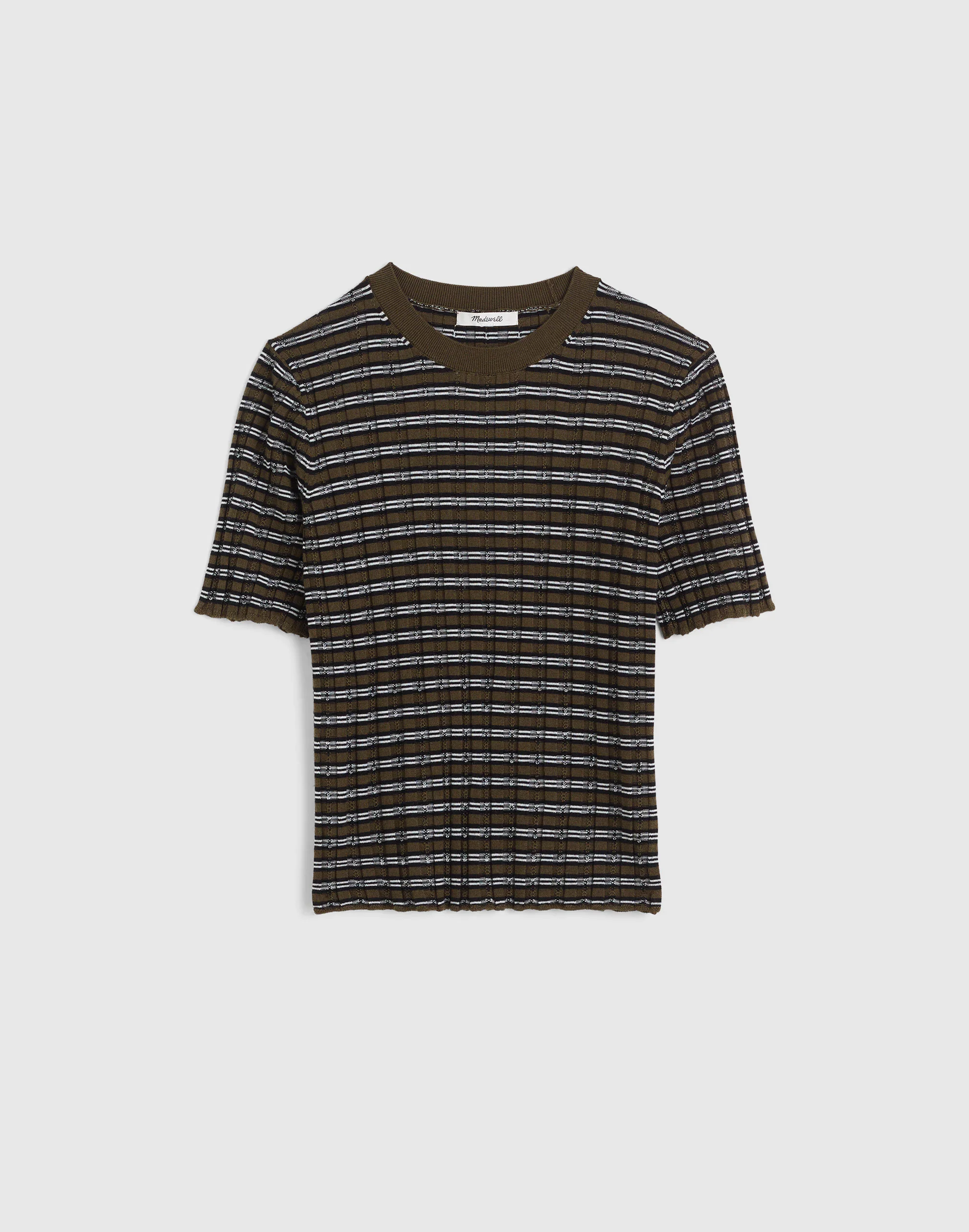 Crafted from a luxe blend of merino wool and silk, this slim-fit tee is designed with thoughtful details like a pointelle stitch and a ribbed crew neckline. The subtle stripe pattern creates adds a touch of polish to an easy silhouette, perfect for layering or wearing on it's own. - Slim fit. - Length: designed to hit between the bellybutton and high hip. - Body length from high point of shoulder: 20 1/2". - 75% merino wool/25% silk. - Dry clean. - Imported. - Item NZ329
