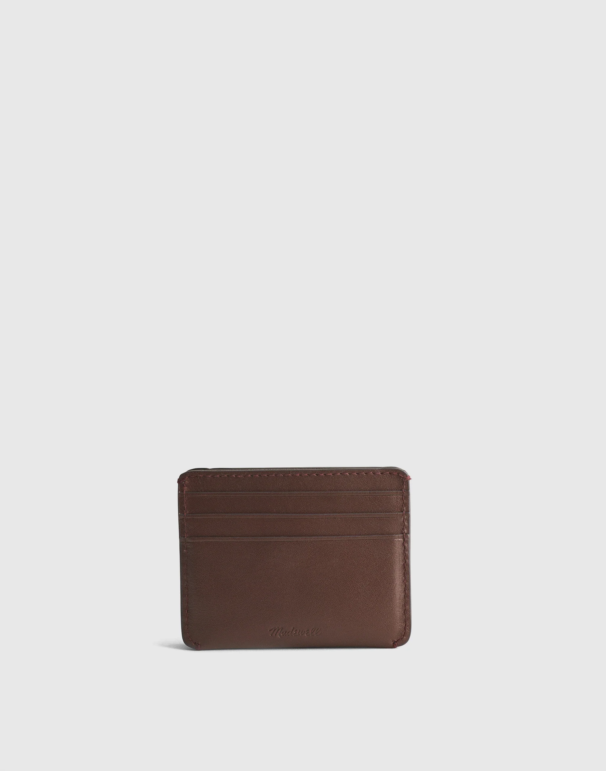 Made from sleek leather, this streamlined card case features a curved silhouette with thoughtful storage. With six slots to keep your cards organized, the middle opening is perfect for storing money or receipts. - 100% leather. - Do Well: leather sourced from a tannery that was certified by the Leather Working Group (LWG), an organization that works to promote sustainable environmental practices in the leather industry. - Card slots. - 3 1/10"H x 3 4/5"W. - Imported. - Select stores. - Item NZ864