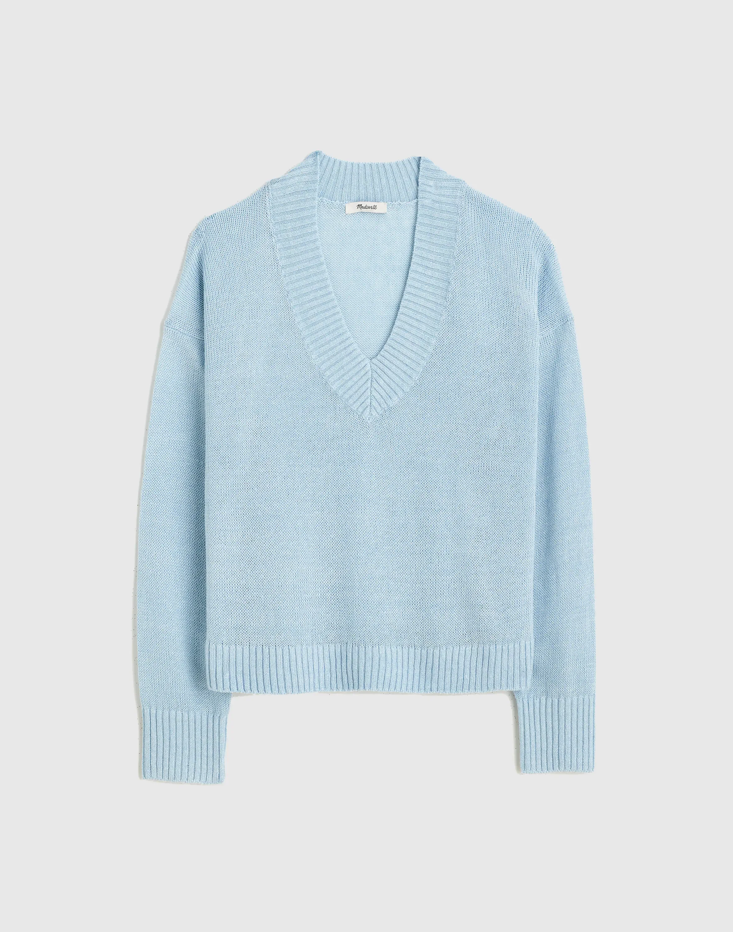 Knit from 100% linen, this breezy V-neck sweater has a relaxed fit and wide-ribbed trim throughout. With endless styling possibilities, you can easily layer it, drape it over the shoulders or tie at the waist. - Relaxed fit. - Length: designed to hit between the bellybutton and high hip. - Body length from high point of shoulder: 21 1/4". - 100% linen. - Hand wash. - Imported. - Item OA207