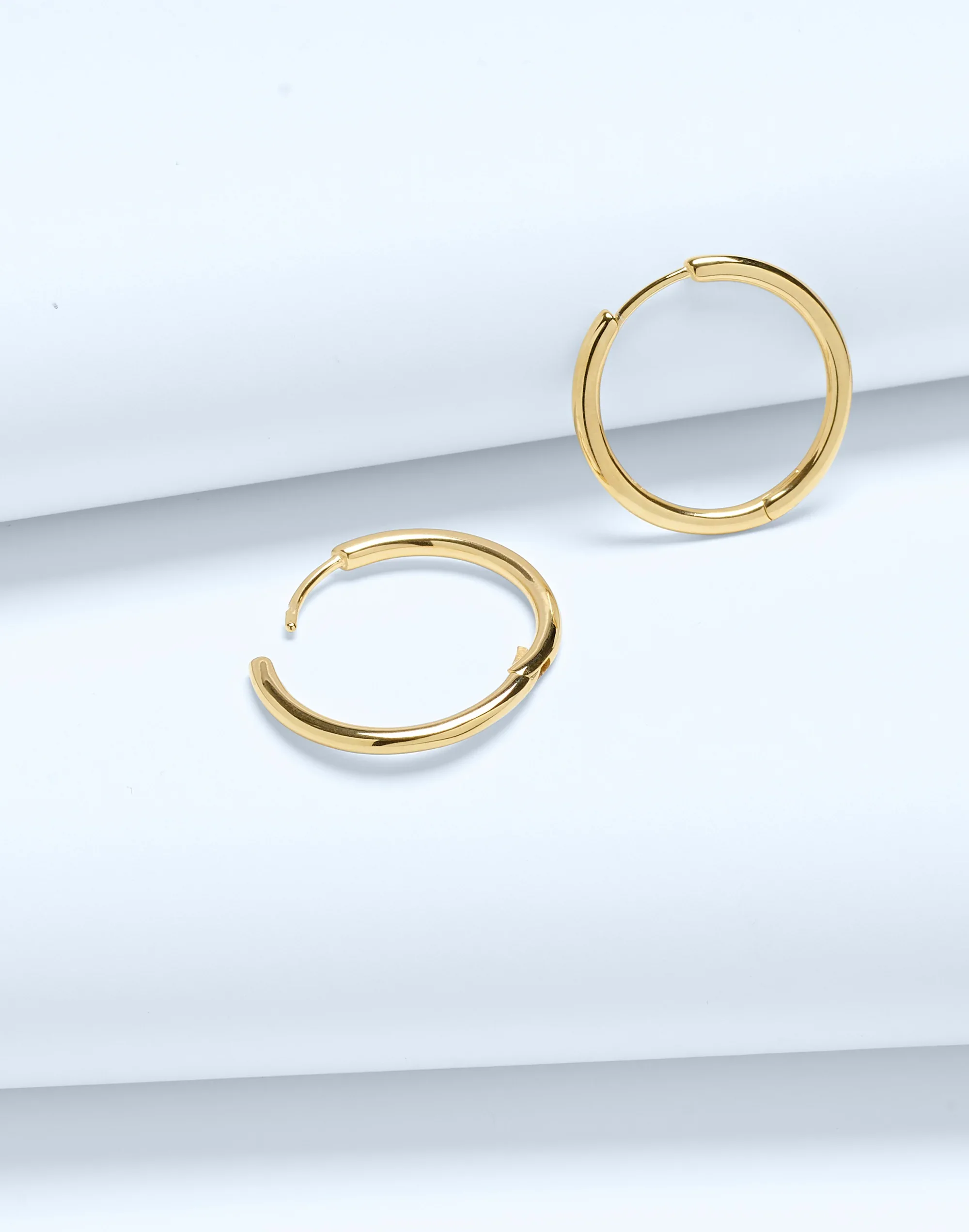 Crafted from 14k gold over sterling silver, our Demi-Fine pieces are future keepsakes meant to be layered and worn every single day (think of them as your jewelry BFFs). These medium huggie hoop earrings are perfect for wearing with anything and everything. - Please note: If the closure doesn't clasp properly, carefully bend the post back into place. The function can be recovered if the post is slightly bent up a bit. - 23 1/2 mm x 24 1/2 mm. - 100% recycled sterling silver. - Do Well: made using recycled factory scrap metals that could otherwise go to waste. - Sterling silver posts are naturally soft due to the high silver content (just bend 'em back into shape if they get out of whack). - Nickel-safe. - Imported. - Item NQ244