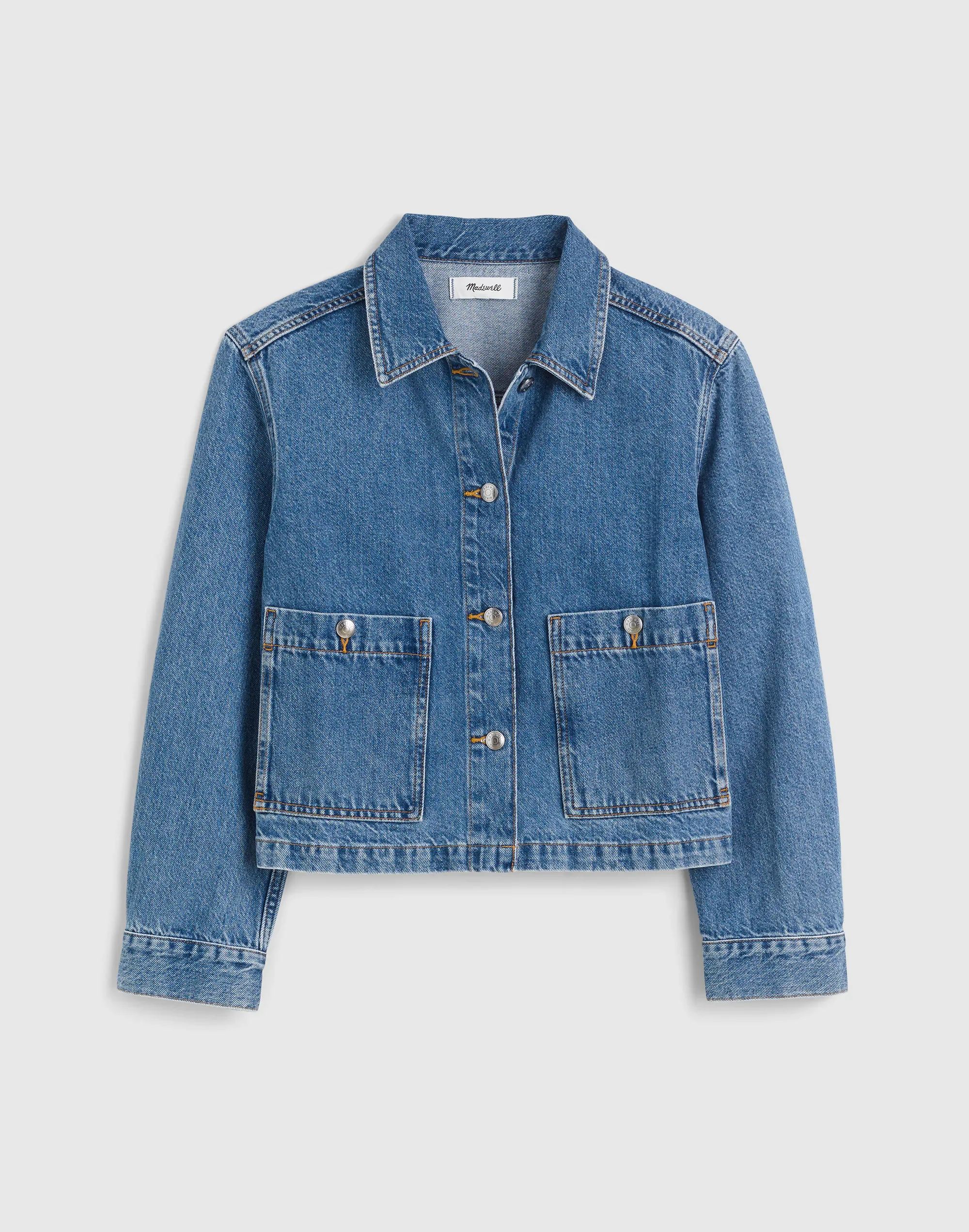 This denim chore jacket features button-front patch pockets and a cropped hem. It's a wardrobe staple you'll reach for again and again. - Cropped fit. - Body length: 22 1/2". - 100% cotton (5% of which is recycled). - Do Well: for each item made at the Fair Trade Certified™ factory, we contribute to a Community Development Fund managed by the workers. - Machine wash. - Imported. - Item NZ018