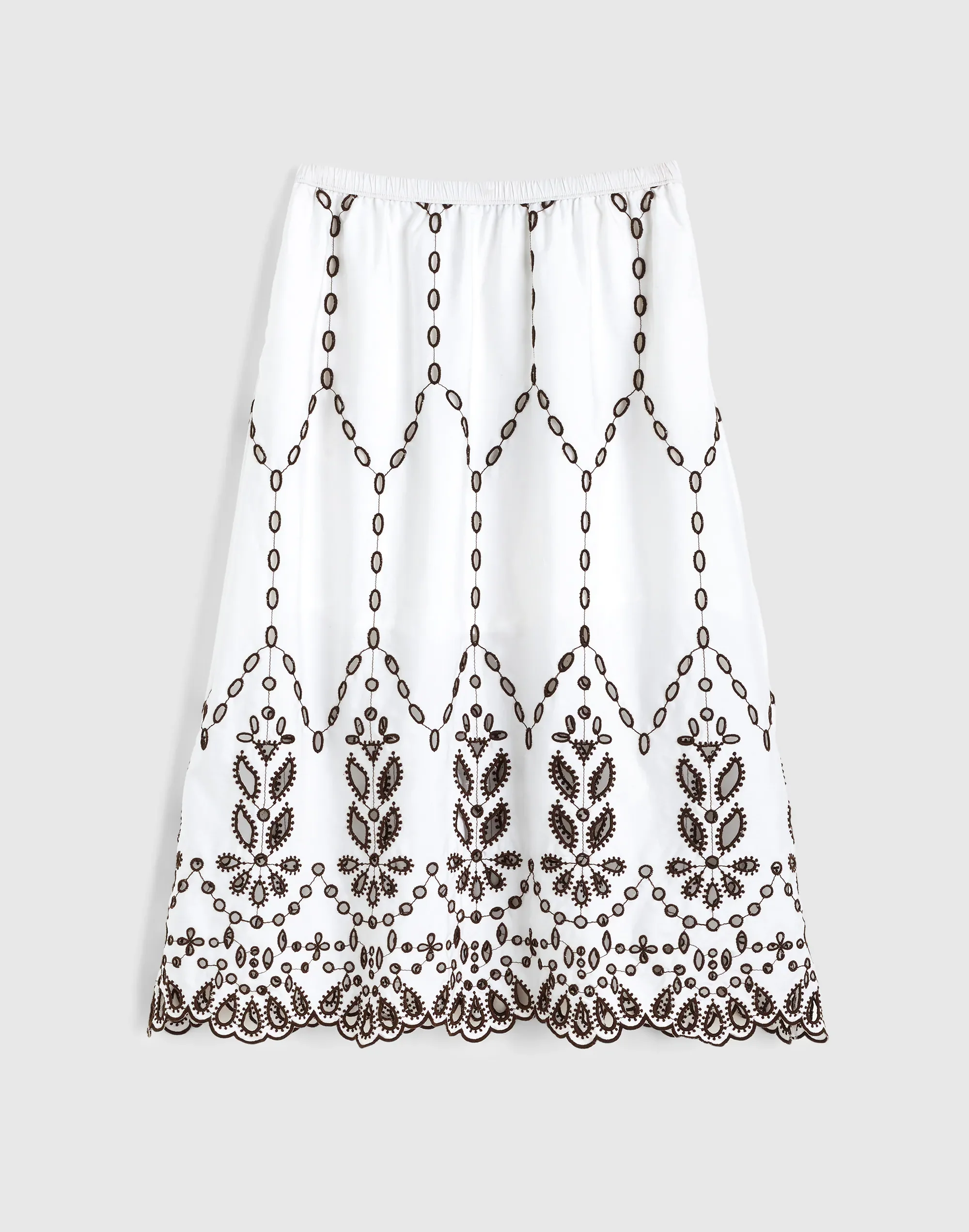 Crafted from 100%, mid-weight cotton poplin, this midi skirt features allover contrast embroidery and a delicate scalloped hem. It has an elasticized waist, side-seam pockets and pairs perfectly with our matching sleeveless top. - 33" long (based on size M). - 100% cotton. - Machine wash. - Imported. - Select stores. - Item NZ499