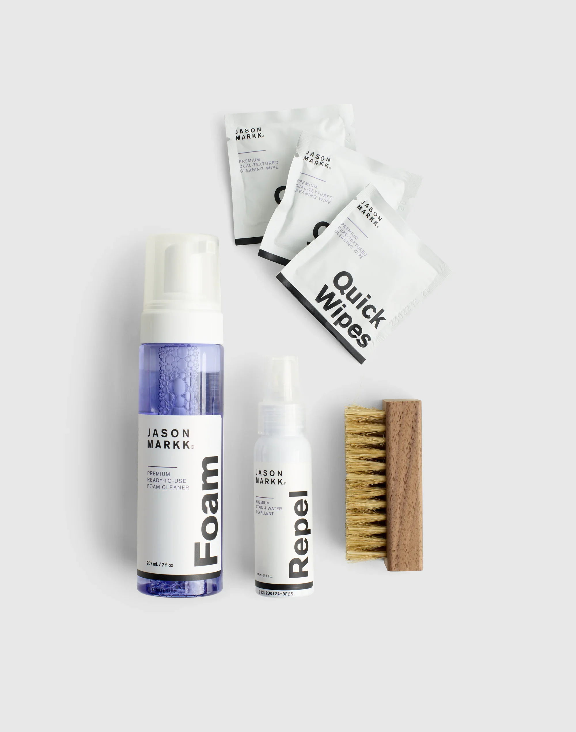 Frustrated with scuffs, LA-based sneakerhead Jason Mark Angsuvarn came up with his own line of products to keep his prized shoes fresh. This kit includes his proprietary foam solution, repellant spray, quick wipes and supersoft brush—perfect for cleaning everything from shoes to suede bags. - Imported. - Select stores. - Item NY783