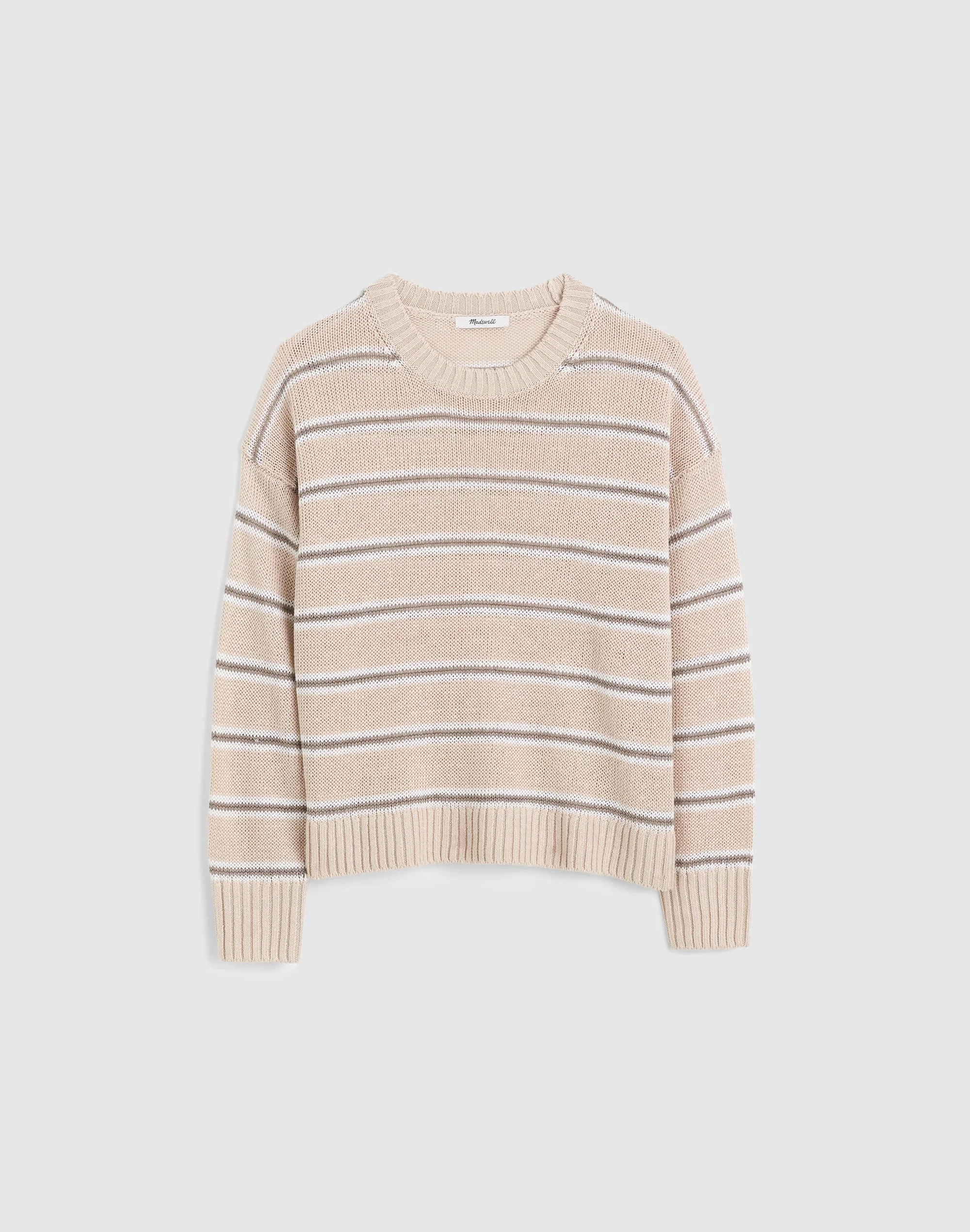 Lightweight and drapey in 100% linen, this relaxed crewneck sweater has dropped shoulders and ribbed trim in a delicate stripe pattern. An easy layering essential to add to your sweater stack. - Relaxed fit. - Length: designed to hit between the bellybutton and high hip. - Body length from high point of shoulder: 21 1/4". - 100% linen. - Machine wash. - Imported. - Item NZ331