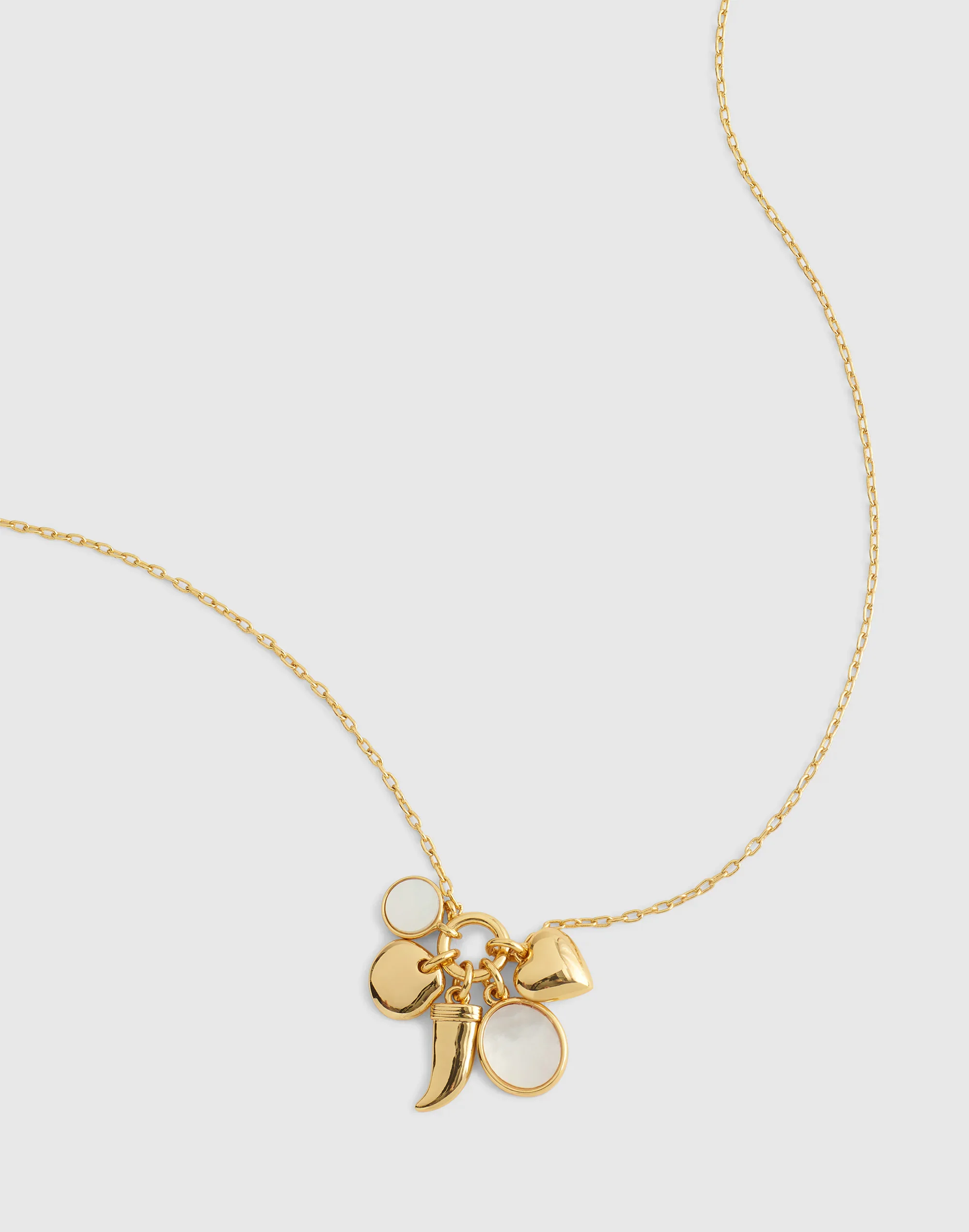 Cast in plated brass, this charm necklace is hung with genuine mother-of-pearl and a metal coin. Wear this piece on its own or layered. - Length: 24" with a 3" extender chain for adjustable length. - Plated brass, mother-of-pearl, cubic zirconia. - Lobster clasp closure. - Nickel-safe. - Clean your jewelry after each wearing with a soft cloth. - Imported. - Item NZ893
