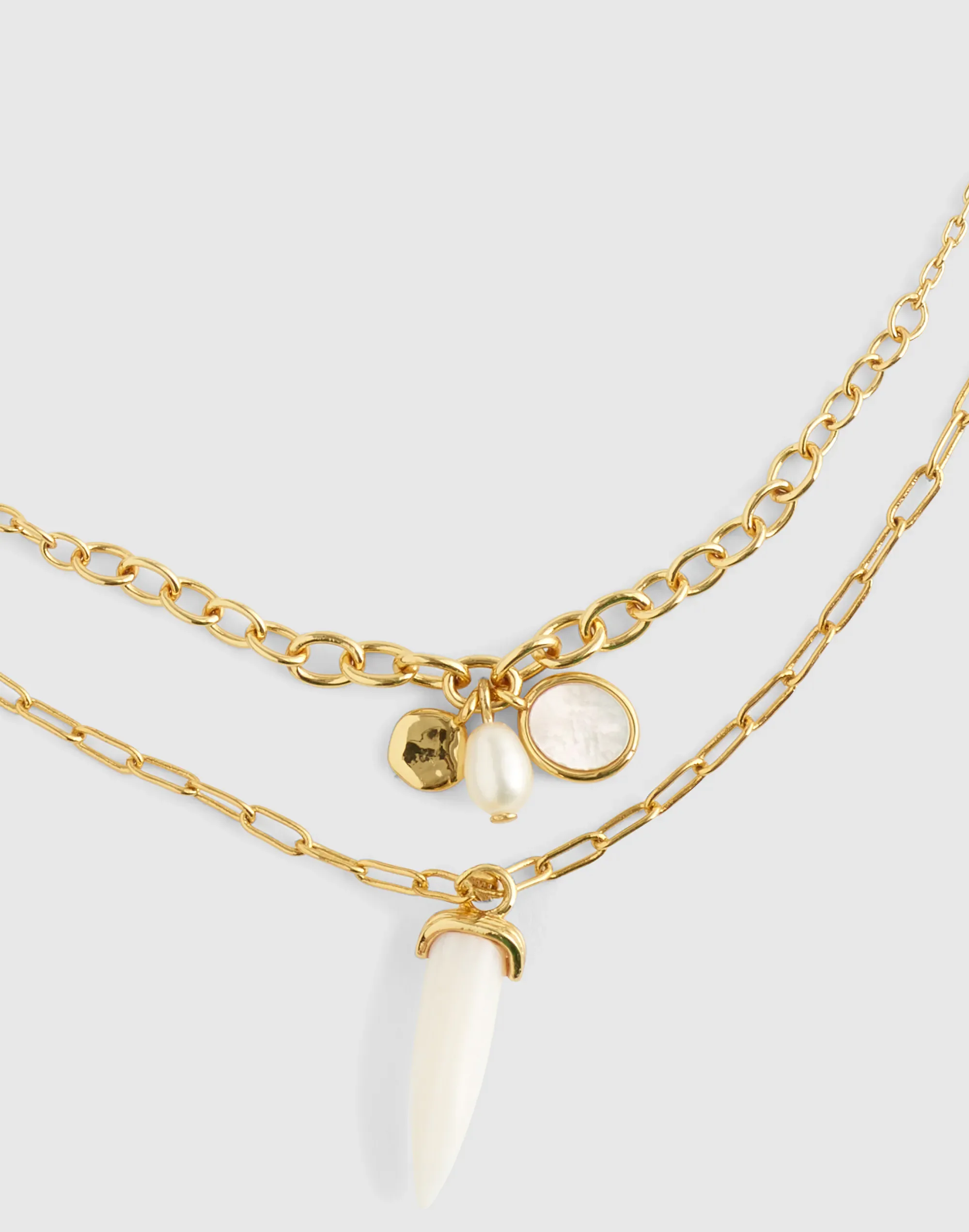 Timeless and versatile, we think you just found your new date night go-to with this two-piece necklace set, featuring shimmery mother-of-pearl. - Length: 16 1/2" with a 6" extender chain for adjustable length. - Plated brass, semiprecious stone, leather cord, cubic zirconia. - Lobster clasp closure. - Nickel-safe. - Clean your jewelry after each wearing with a soft cloth. - Imported. - Item NZ836