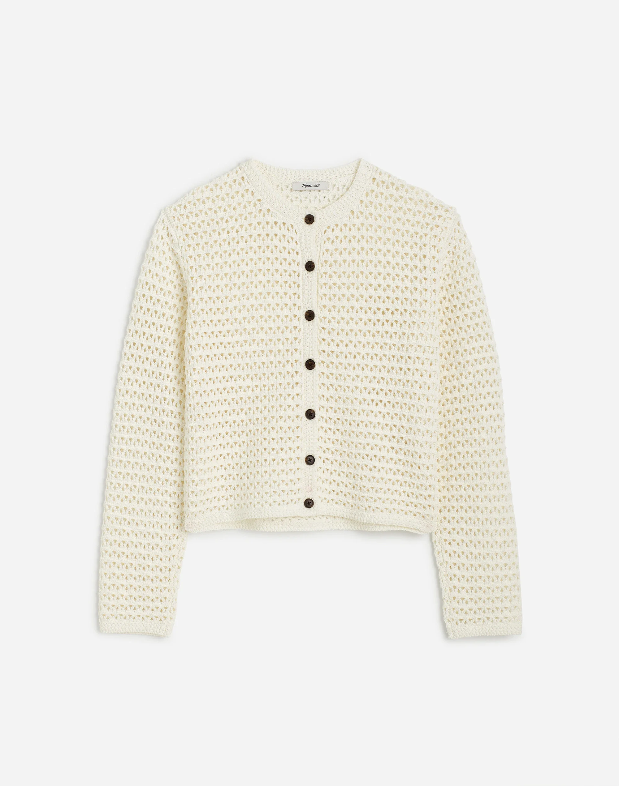 Channel effortless cool in this textural pointelle sweater cardigan made from 100% cotton. Featuring a body-skimming fit and open stitch design, it features trimmed details and contrasting to elevate its everyday appeal. - Relaxed fit. - Crop length: designed to hit low on the ribcage and show a hint of skin. - Body length from high point of shoulder: 19". - 100% cotton. - Machine wash. - Imported. - Item NV684