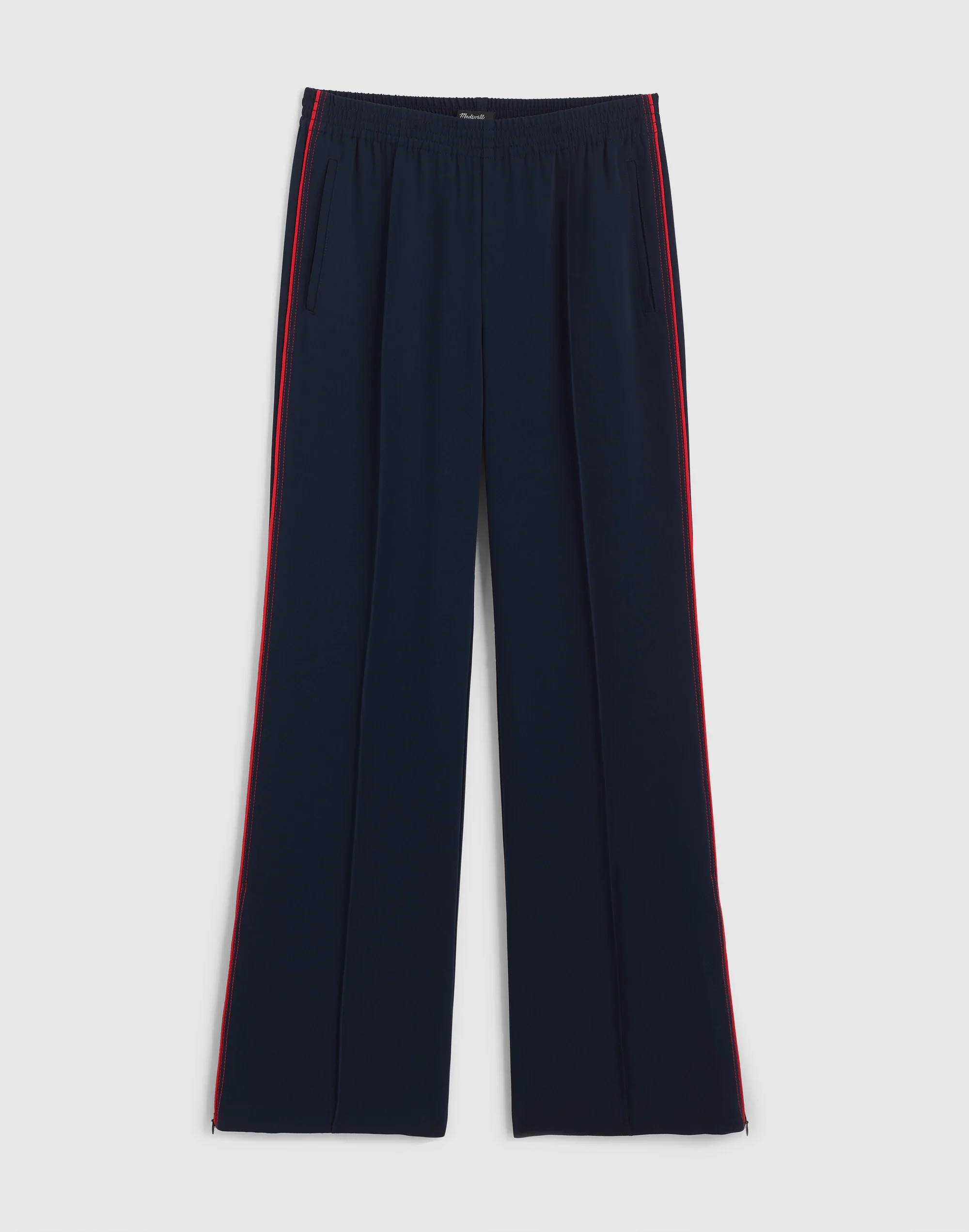 Sporty meets polished, these pull-on pants feature a comfortable elasticized waist, track stripe along the sides and front welt pockets. Coming in crepe, they have a bootcut leg that can be flared for more of a dramatic look thanks to the concealed ankle zip. - 11 1/2" rise, 23 1/2" leg opening, 30" inseam. - Shell: 100% polyester. - Piping: 51% acetate/49% viscose. - Machine wash. - Imported. - Madewell.com only. - Item NZ253