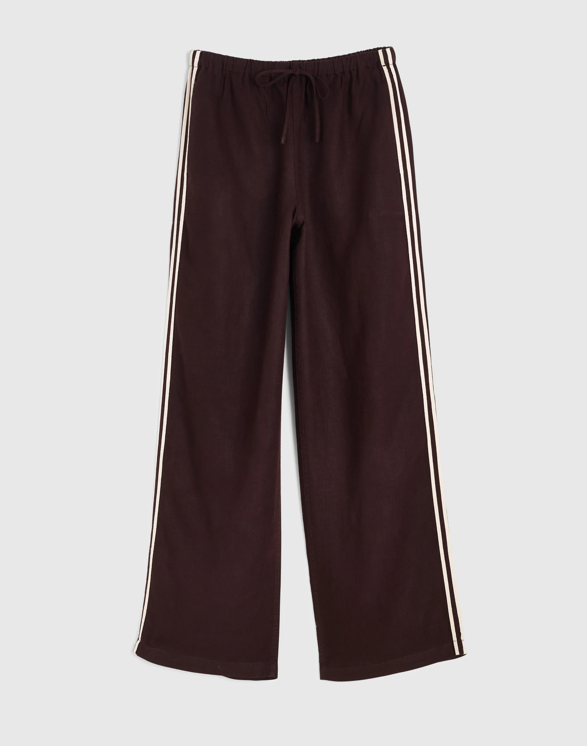 Coming in 100% linen, these warm weather-ready pull-on pants feature an elasticized waist for wear-all-day comfort. With contrast track stripes along the side for a sporty touch, this pair is completed with a drawcord. - 12" rise, 22" leg opening, 30" inseam. - 100% linen. - Machine wash. - Imported. - Item NZ309