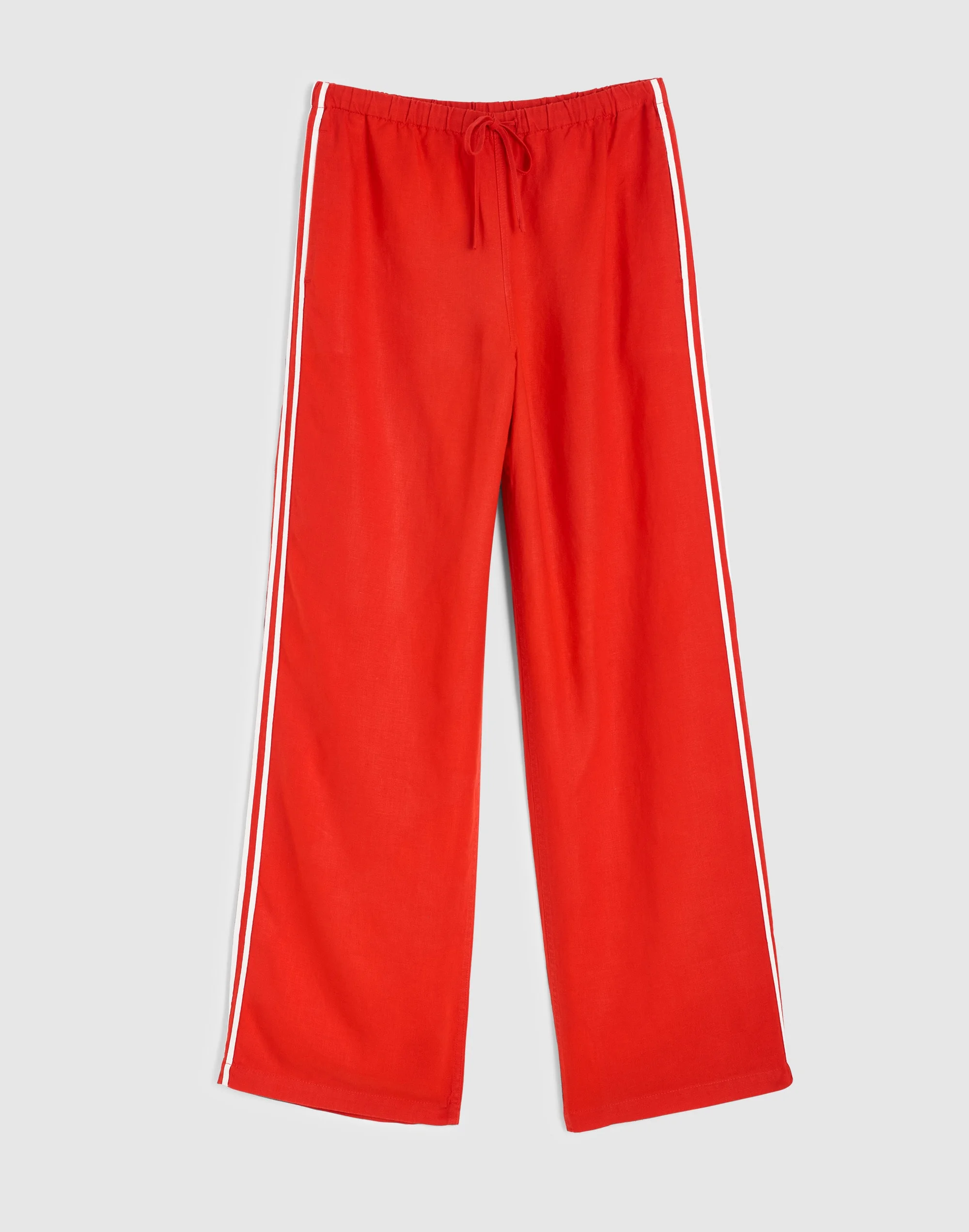 Coming in 100% linen, these warm weather-ready pull-on pants feature an elasticized waist for wear-all-day comfort. With contrast track stripes along the side for a sporty touch, this pair is completed with a drawcord. - 12" rise, 22" leg opening, 30" inseam. - 100% linen. - Machine wash. - Imported. - Item NZ309