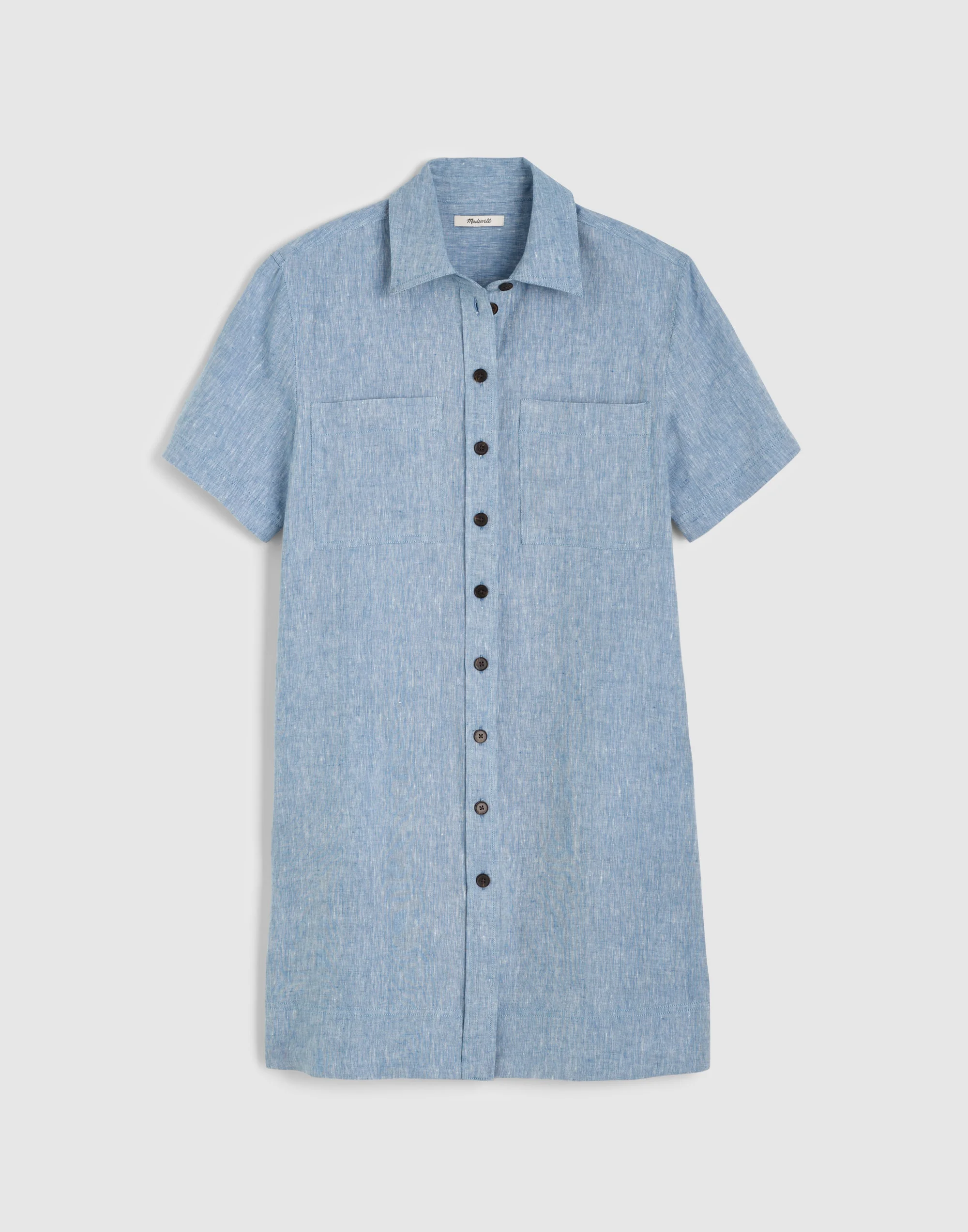 Effortless in 100% linen, this mini shirtdress features a point collar, relaxed drop shoulders, patch chest pockets and hidden side-seam pockets. A wardrobe essential for warmer days ahead. - Regular fit. - Falls 35 1/2" from high point of shoulder (based on size M). - 100% linen. - Machine wash. - Imported. - Select stores. - Item NZ645
